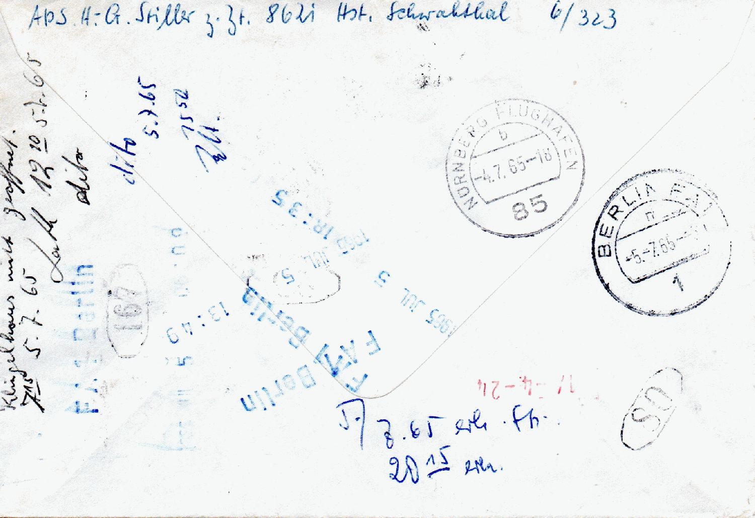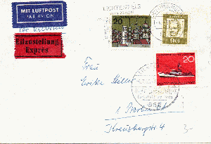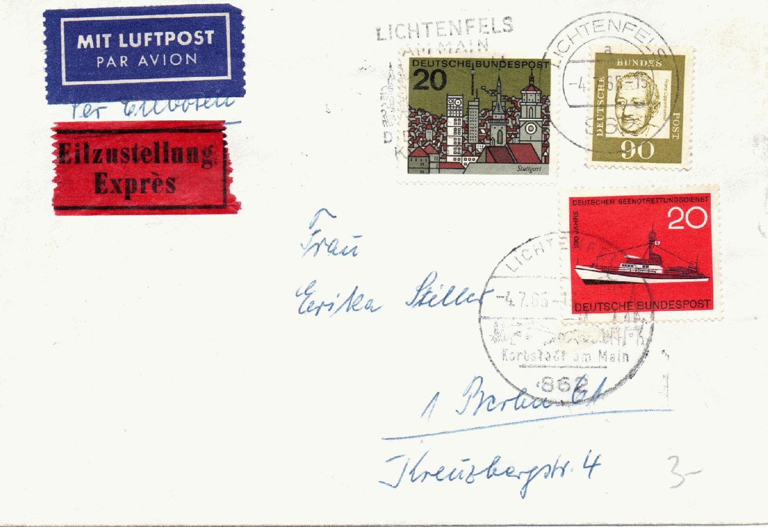 Luftpost Eilbrief vom 04.07.1965 von Lichtenfels nach Berlin, portorichtig frankiert mit Michel Nr. 426, 360 und 475. Brief zweite Gewichtstufe 40, Eilzustellung 80 und Luftpost 10 Pfennig, gesamt 130 Pfennig. Auf der Rückseite Stempel von Nürnberg Flughafen vom 04.07.1965 und Berlin vom 05.07.1965, weiter mehrere Vermerke über erfolglose Zustellungsversuche und zugestellt am 05.07.1965 um 20.15 Uhr, sowie drei Briefträgerstempel.
