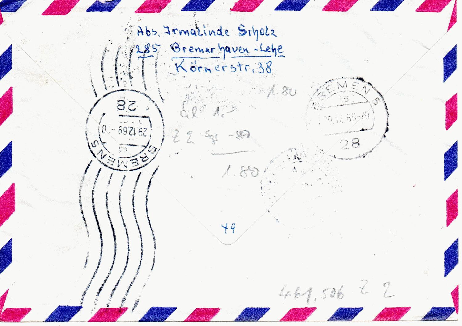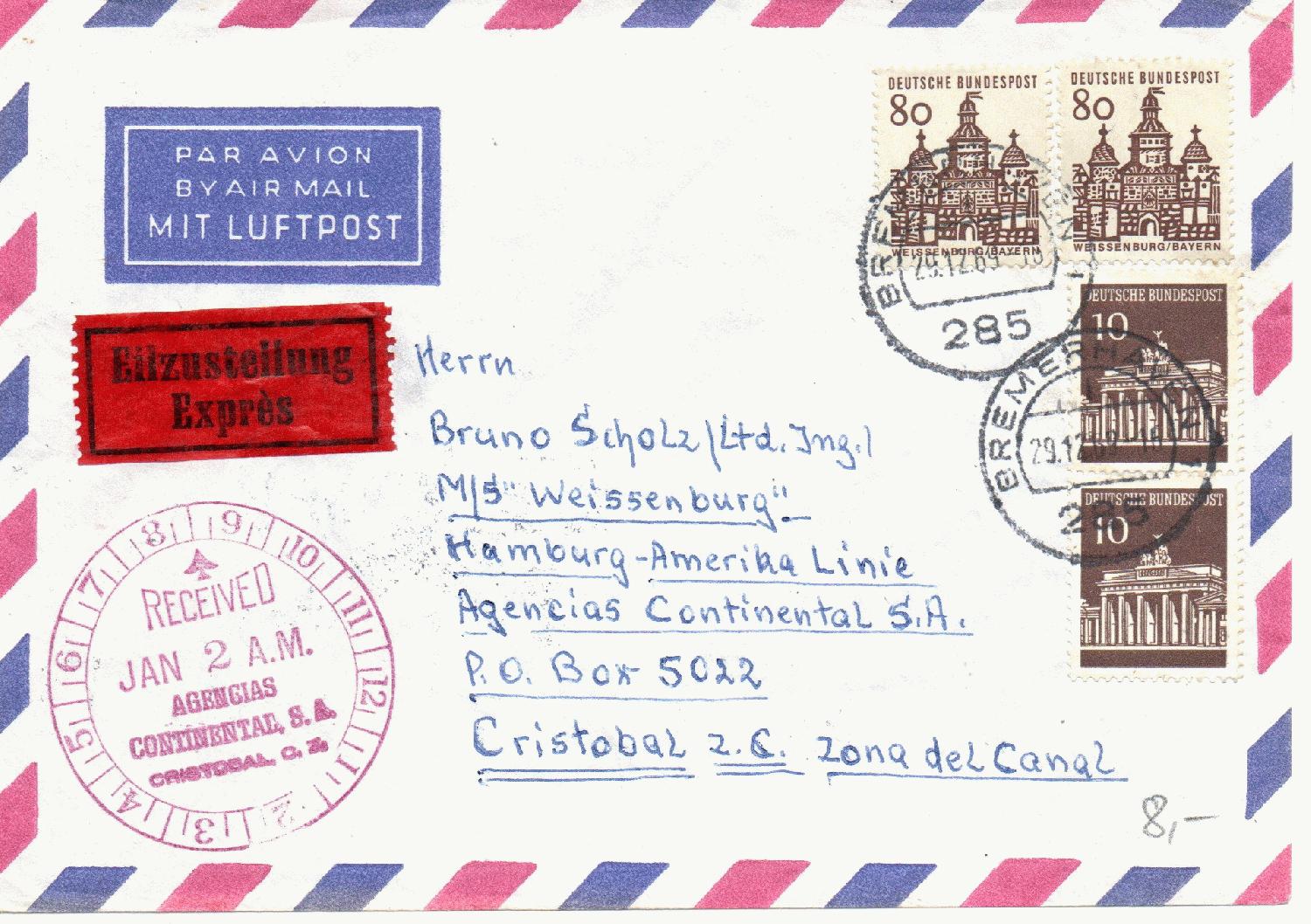 Eilbrief per Luftpost vom 29.12.1969 Bremerhaven nach Cristobal/Panama/Kanalzone, zwei Stempel von Bremen vom 29.12.1969 und ein Stempel vom Flughafen Frankfurt vom 30.12.1969 (schlecht lesbar).