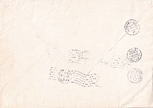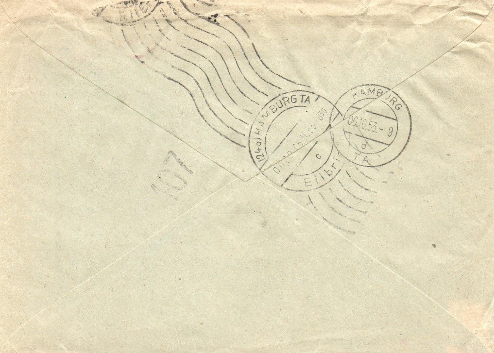 Auf der Rückseite ist nicht mehr viel Platz für Stempel und Vermerke. Es sind diverse Stempel von Hamburg vom 4.8.1964, und die Vermerke das der Empfänger nicht zu ermitteln ist. Der Brief kam am 6.8.1964 in Wuppertal, dem Wohnort des Absender, an.
