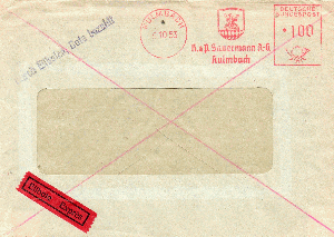 Passend zu dem von Christoph gezeigten Beleg mit den Einzeilern hier ein Brief als Einschreiben-Eilboten mit gleich 4 von diesen Einzeilern auf der Rückseite.
