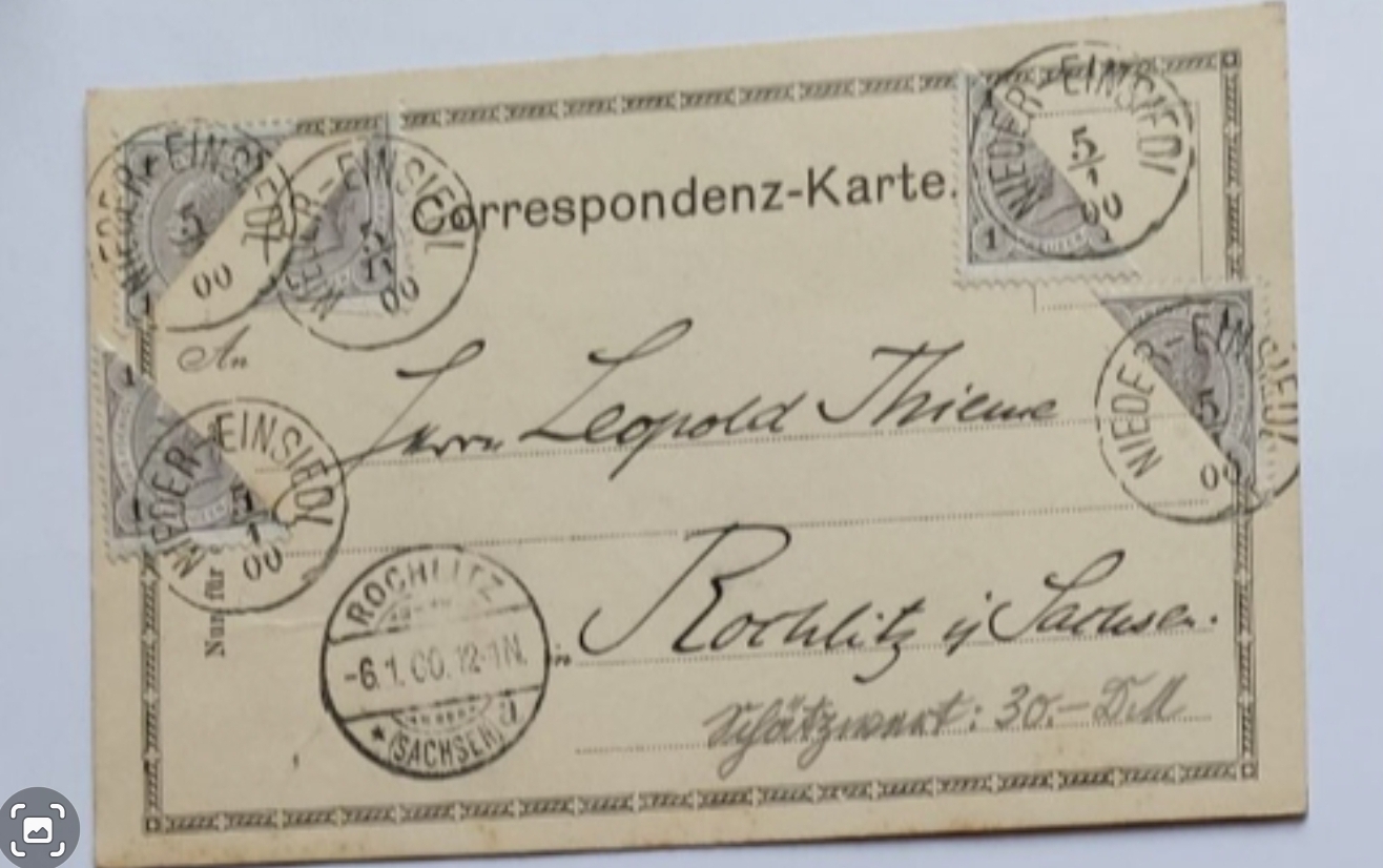 ich habe auch eine interessante Karte die mit 5 halbierten 1 Kreuzer Briefmarken frankiert wurde. Aufgegeben am 05.01.1900 in Nieder-Einsiedl und Ankunft laut Stempel am 06.01.1900 in Rochlitz/Sachsen.