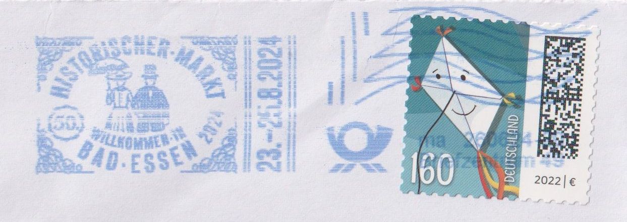 ... PostJet-Tintenstahler der ILBO ma Briefzentrum 49 vom 120624-20 (12. Juni 2024). Leider ist das zugeschaltete Werbeklischee zum '50. Historischen Markt Bad Essen' kaum zu erahnen, deshalb hier als Auszug die Ankündigung aus der Ausgabe 11-2024 des Postmagazins "Stempel & Informationen" (dort die Stempelnr. 11/BZ005):