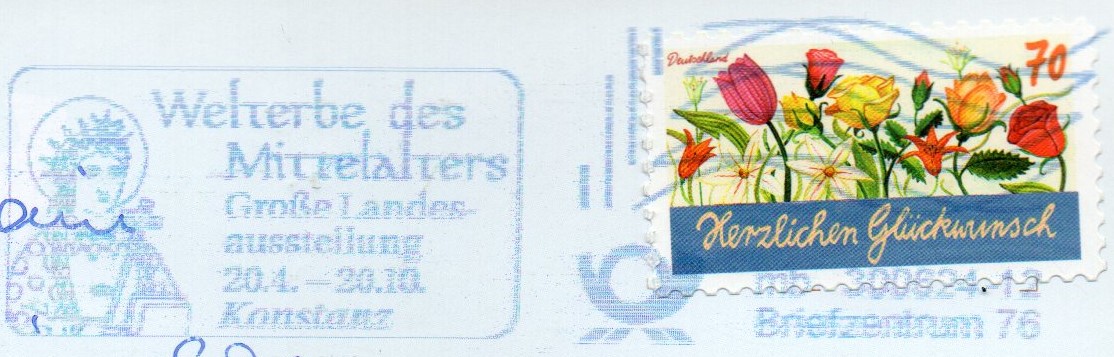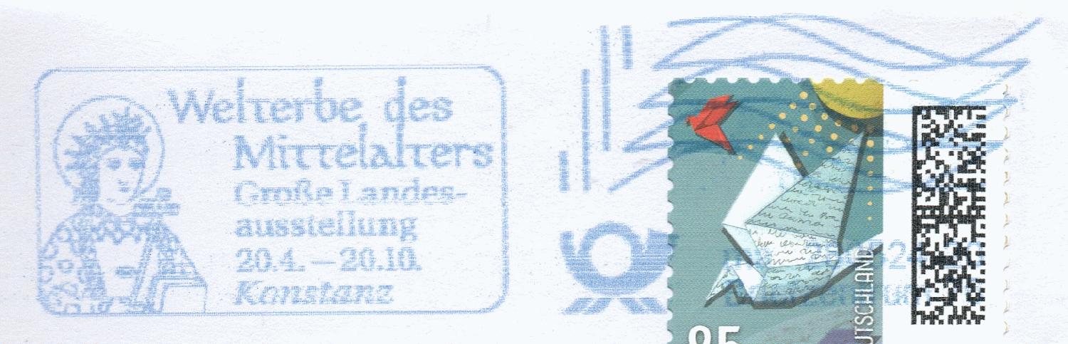 Den von Dir jüngst gezeigten Tintenstrahlstempel vom Briefzentrum 76 mit dem Werbeklischee "Welterbe des Mittelalters - Große Landesausstellung 20.4. - 20.10. Konstanz" gibt es auch mit den UB mb.