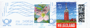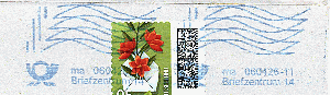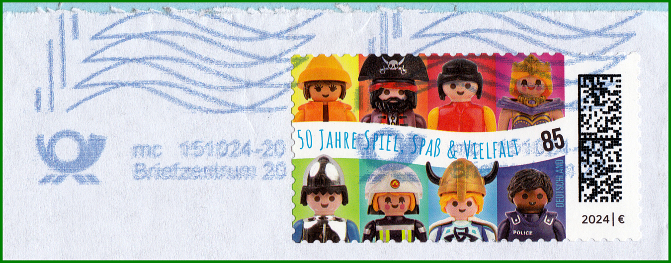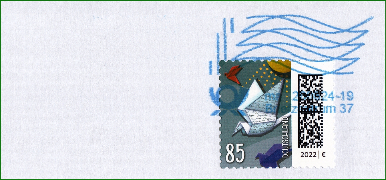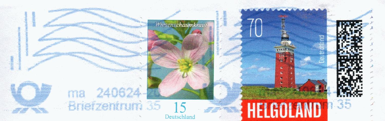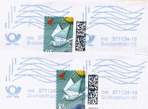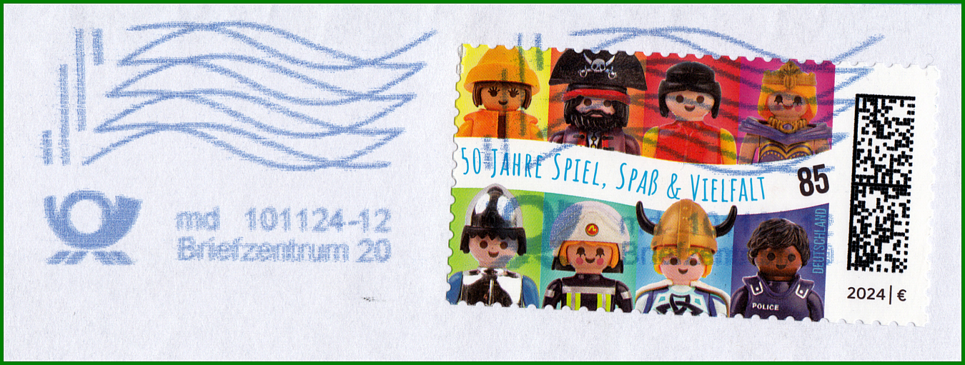PostJet-Tintenstahler md Briefzentrum 20 101124-12, d.h. vom 10. November 2024, ebenfalls mit einem (in diesem Fall theoretisch aber unnötigen) weiteren "Wellen-Element" im Bereich des "Werbeklischees". Die Frage die sich mir hier dabei stellt, werden das zusätzliche Wellen-Element in der Software manuell fest voreingestellt (d.h. das Gerät druckt grundsätzlich nimmer ein oder zwei Wellen-Elemente) oder durch die Sortieranlage (d.h. erst durch die Erkennung einer Briefmarke) gesteuert hinzugedruckt.