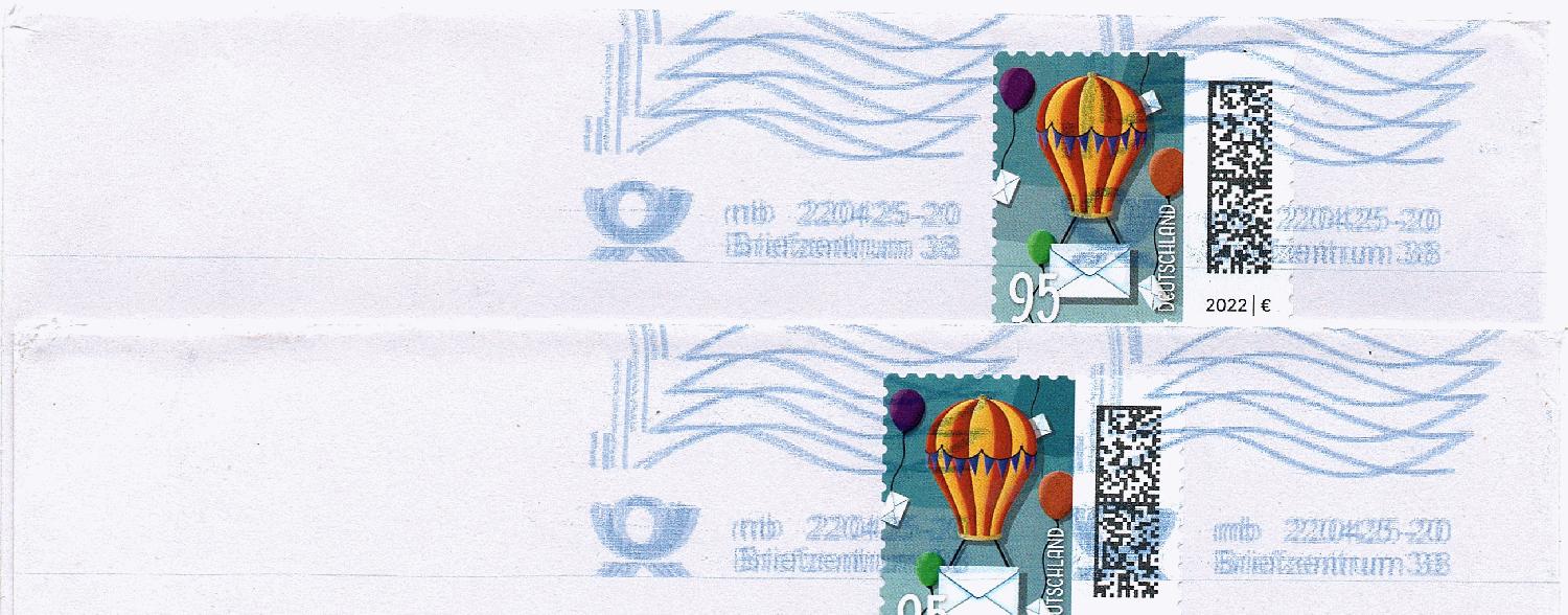 PostJet BRIEFZENTRUM 38 mb vom 22.04.2025, aber beide Briefe mit einem dünnen blauen Linie unten am Posthorn über den ganzen Brief!