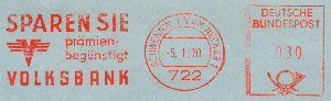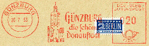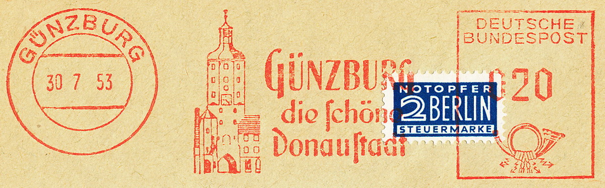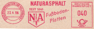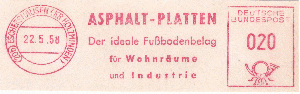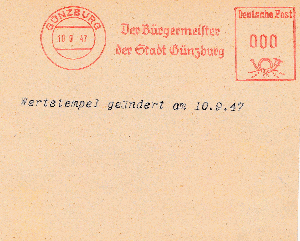 Nach dem Krieg gab es einen neuen Werbeeinsatz und einen neuen Wertrahmen. Der Tagesstempel und die gotischen Wertziffern in der Francotyp A sind geblieben.