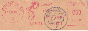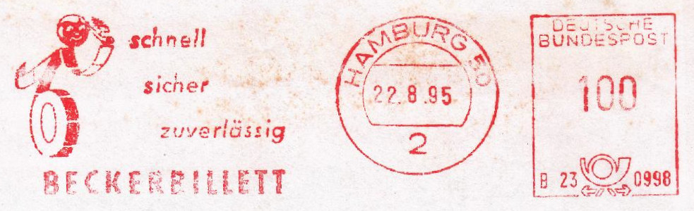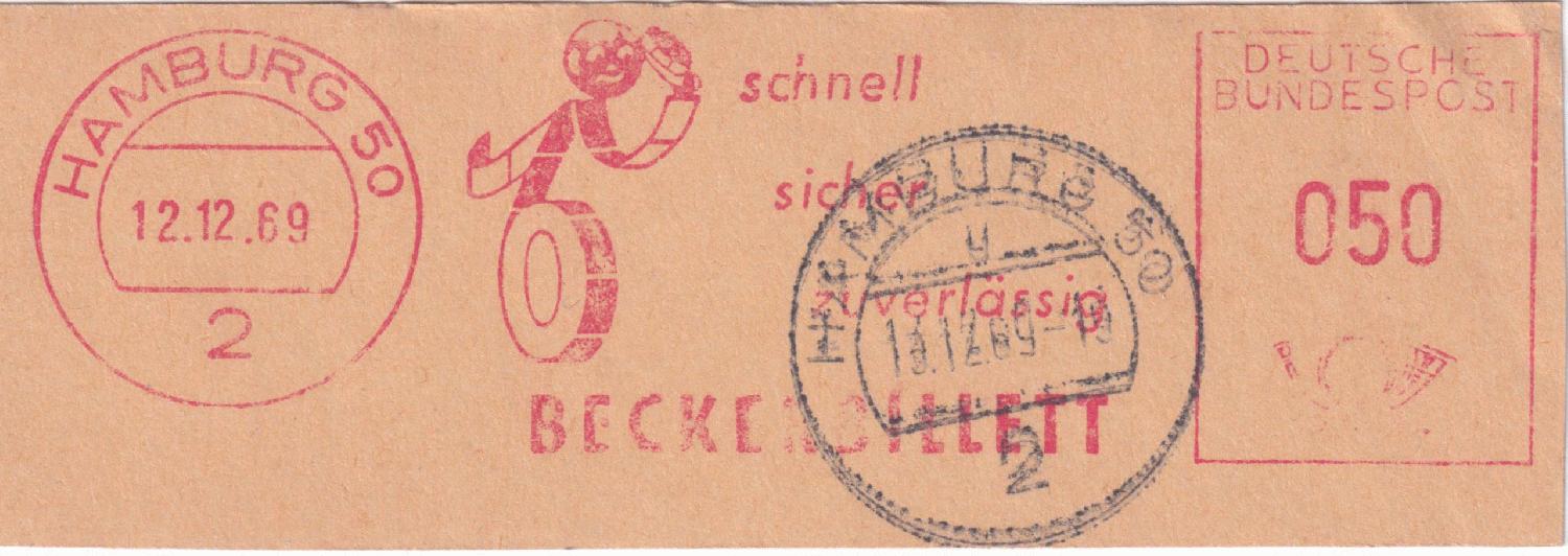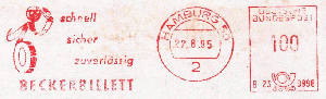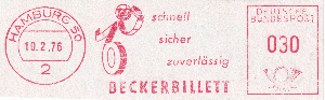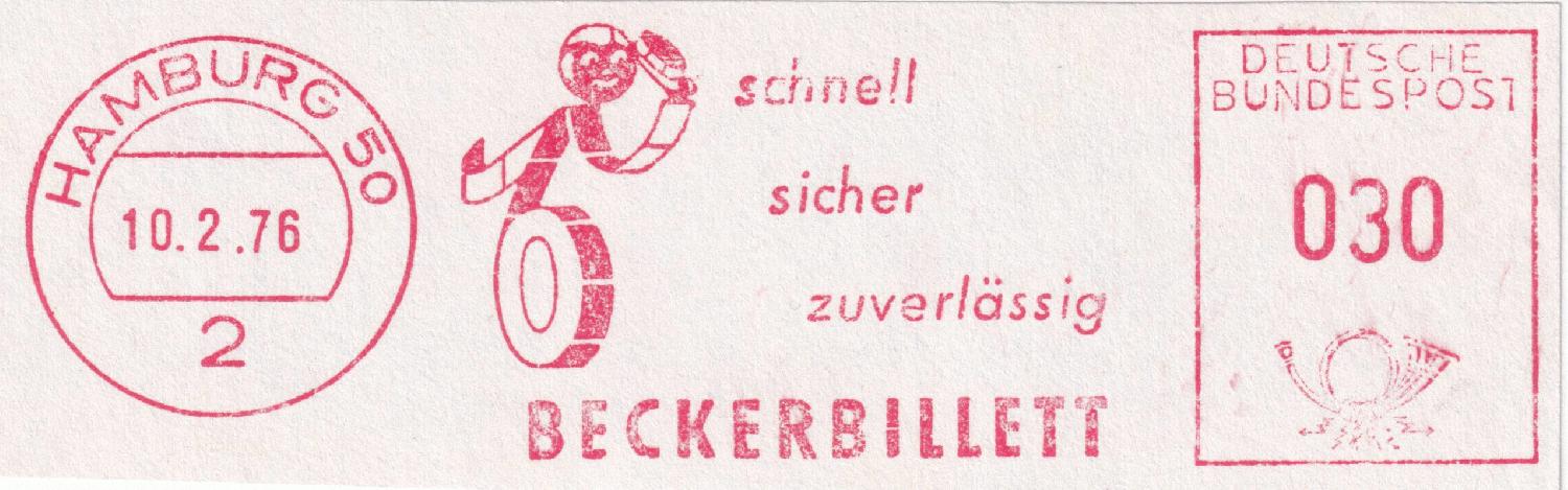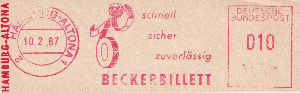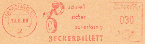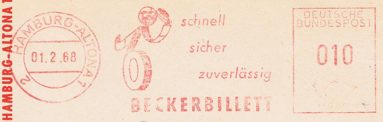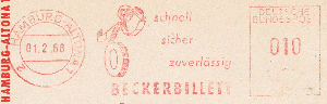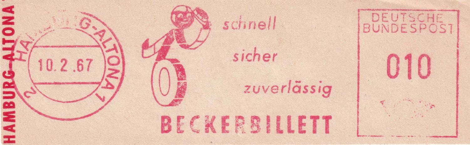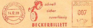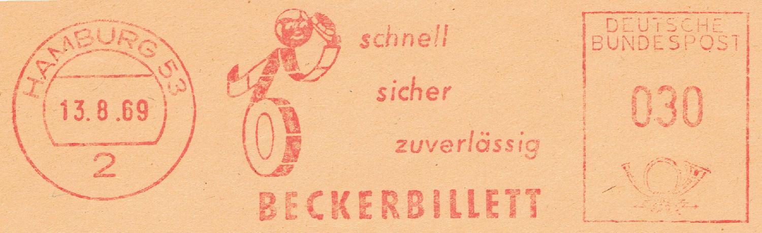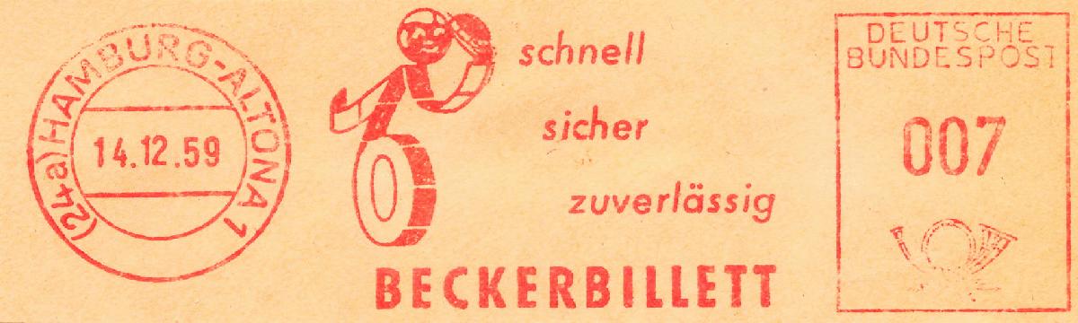 die Firma Beckerbillett ist in Deutschland einer der Marktführer für die Herstellung von Eintrittskarten und Tickets. Von 1959 bis 1995 verwendete man dort immer dasselbe Werbeklischee. Der Ortsstempel und der Wertrahmen haben sich mehrmals geändert.