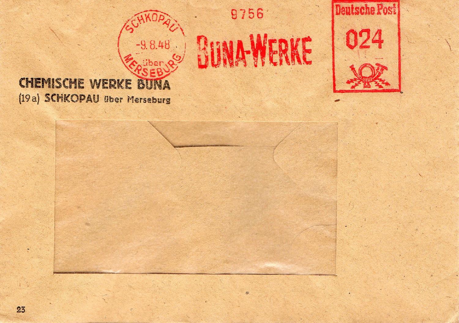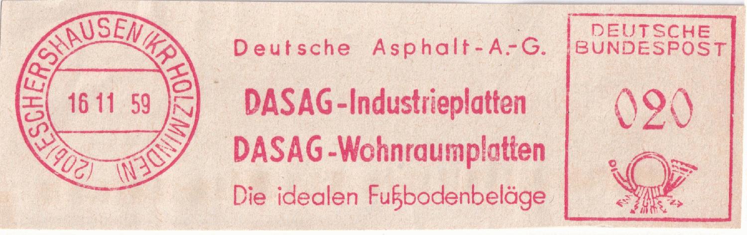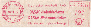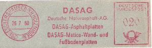 Da ich nur weiß, dass die Übernahme 1956 stattfand, kann ich nicht sagen, ob der erste Stempel aus dem Jahr 1956 vor oder nach der Übernahme aufgebracht wurde. Der Name DASAG taucht zwar erst beim dritten Stempel auf, der zweite Stempel von 1958 ist aber sehr wahrscheinlich der DASAG zuzuordnen. Ich weiß daher nicht ob es eine Abfolge von vier Absenderfreistempeln der DASAG ist oder ob es jeweils zwei Stempel von zwei verschiedenen Firmen sind.