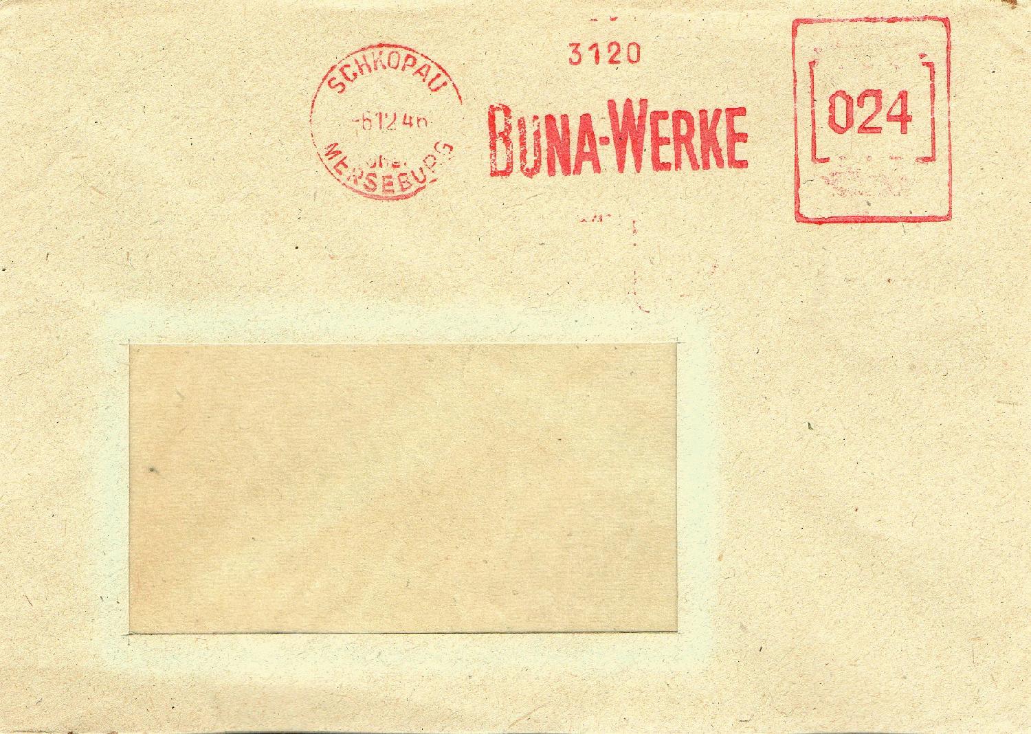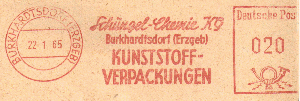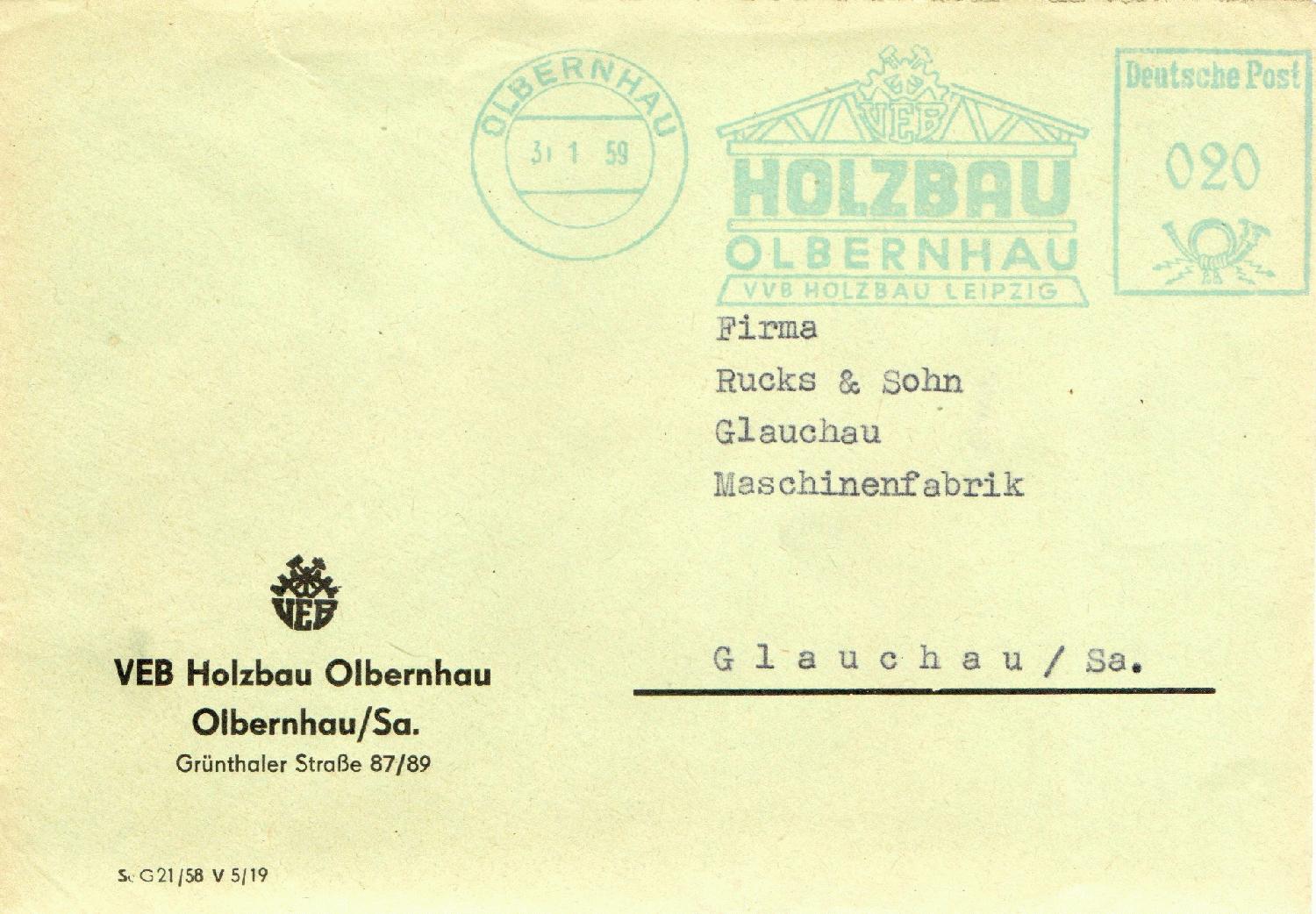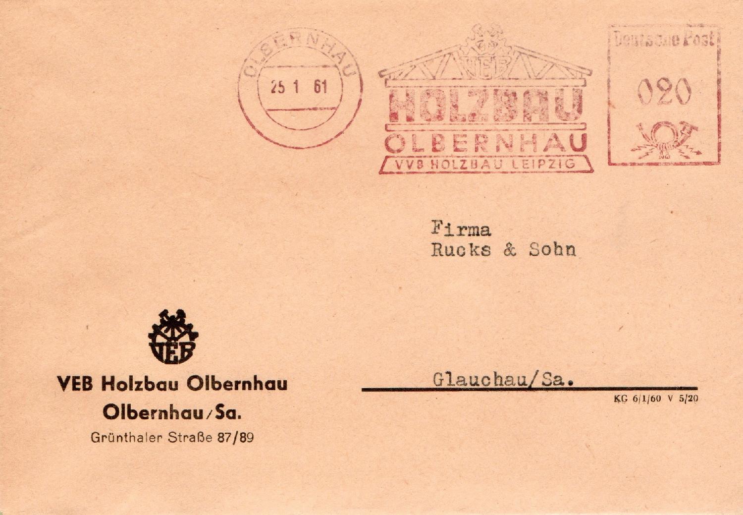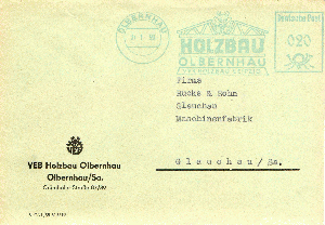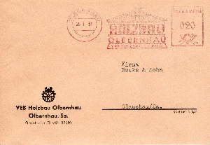 Der VEB Holzbau Olbernhaus nutzte bis mindestens Januar 1959 einen blauen Abdruck in ihrer Maschine, irgendwann später, hier auf einem Beleg im Januar 1961 zu sehen, wurde dann wieder die "normale" rote Druckerfarbe eingefüllt, die der Vorgabe der UPU entsprach.