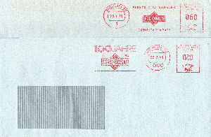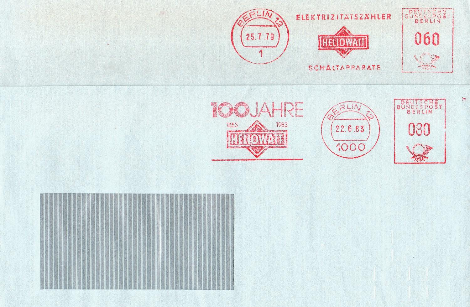 Die Heliowatt-Werke in Berlin nutzten ihre AFS Maschine (E-24) schon länger, der bisherige Wertrahmen weist noch eine alte Schriftform und der Tagesstempel noch eine einstellige PLZ auf, Anfang der 80er-Jahre stellte man dann wohl auf die vierstellige PLZ um und nutzte nun eine neue Maschine des Typs E-27 (Ortsstempel neben dem Wertrahmen) für den Postverkehr.