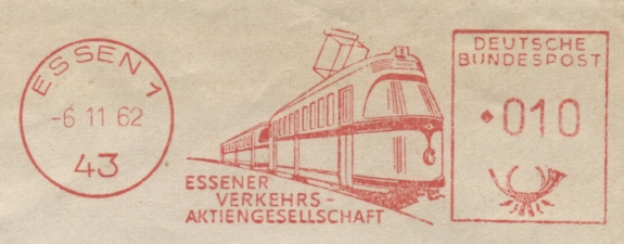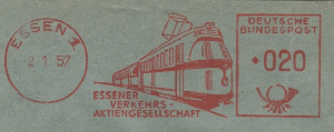 Vom 2.1.57 kann ich eine Francotyp D zeigen, die auch den neuen Firmennamen Essener Verkehrs-Aktiengesellschaft (EVAG) zeigt.