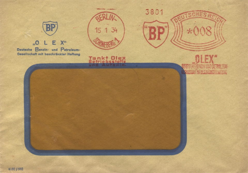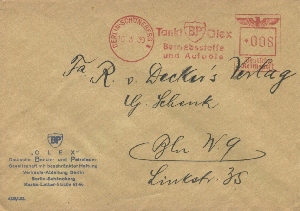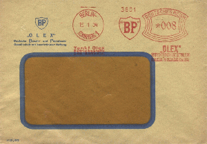 BP OLEX aus Berlin-Schöneberg verwendete im Januar 1934 eine Francotyp A mit Wertrahmen Bogenrechteck.