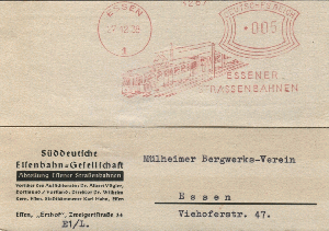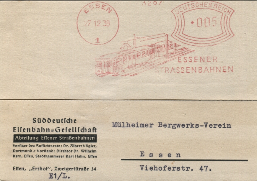 Mein erster AFS stammt von einer Francotyp A mit der Besonderheit von gotischen Wertziffern. Der Stempel wurde am 27.12.38 verwendet von der Süddeutschen Eisenbahngesellschaft, Abteilung Essener Straßenbahnen. Wer sich für deren Geschichte interessiert findet hier [1] reichlich Lesestoff.