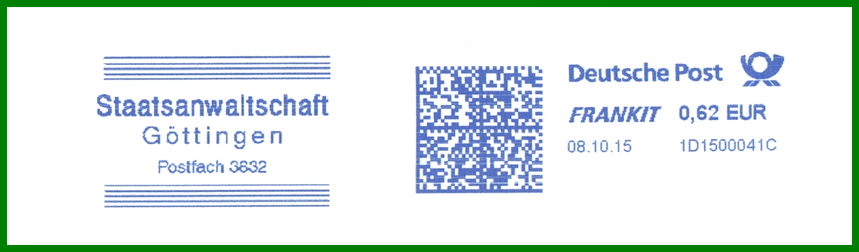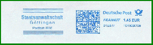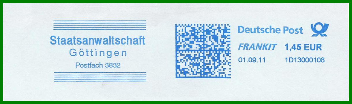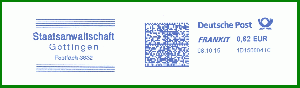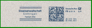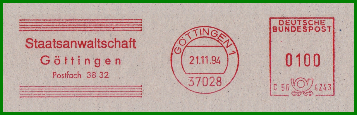 GÖTTINGEN 1 / 37028 vom 21.11.1994. Gerätenummer wieder C564243. Bei der im Tagesstempel verwendeten Postleitzahl handelt es sich um die für die Postfächer. Klischee "Staatsanwaltschaft / Göttingen / Postfach 38 32". Zur FRANKIT-Zeit im neuen Jahrtausend gab die Behörde ihre Postbearbeitung dann an externe Dienstleister ab, d.h. es kamen nun verschiedene Fremdgeräte zum Einsatz, wobei das Klischee in seiner Grundform auch in der digitalen Ausführung erhalten blieb.
