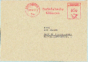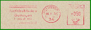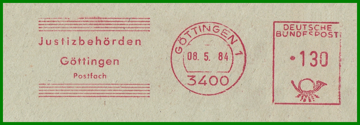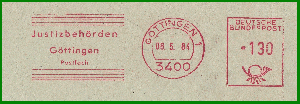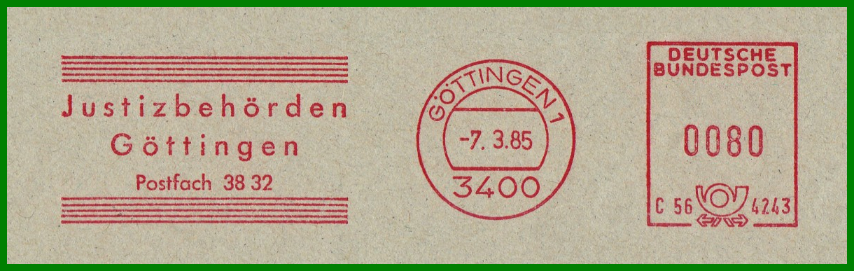 GÖTTINGEN 1 / 3400 vom 07.03.1985, nun mit Gerätenummer C564243, d.h. nun kommen Hassler, statt Francotyp-Geräte zum Einsatz. Und das Klischee zeigt nun ein neues Postfach "Justizbehörden / Göttingen / Postfach 38 32". Später, parallel mit der Einführung der neuen 5-stelligen Postleitzahl, wurde bei diesem Gerät nun das Klischee der Staatsanwaltschaft - unter der selben Postfachnummer - gesetzt: