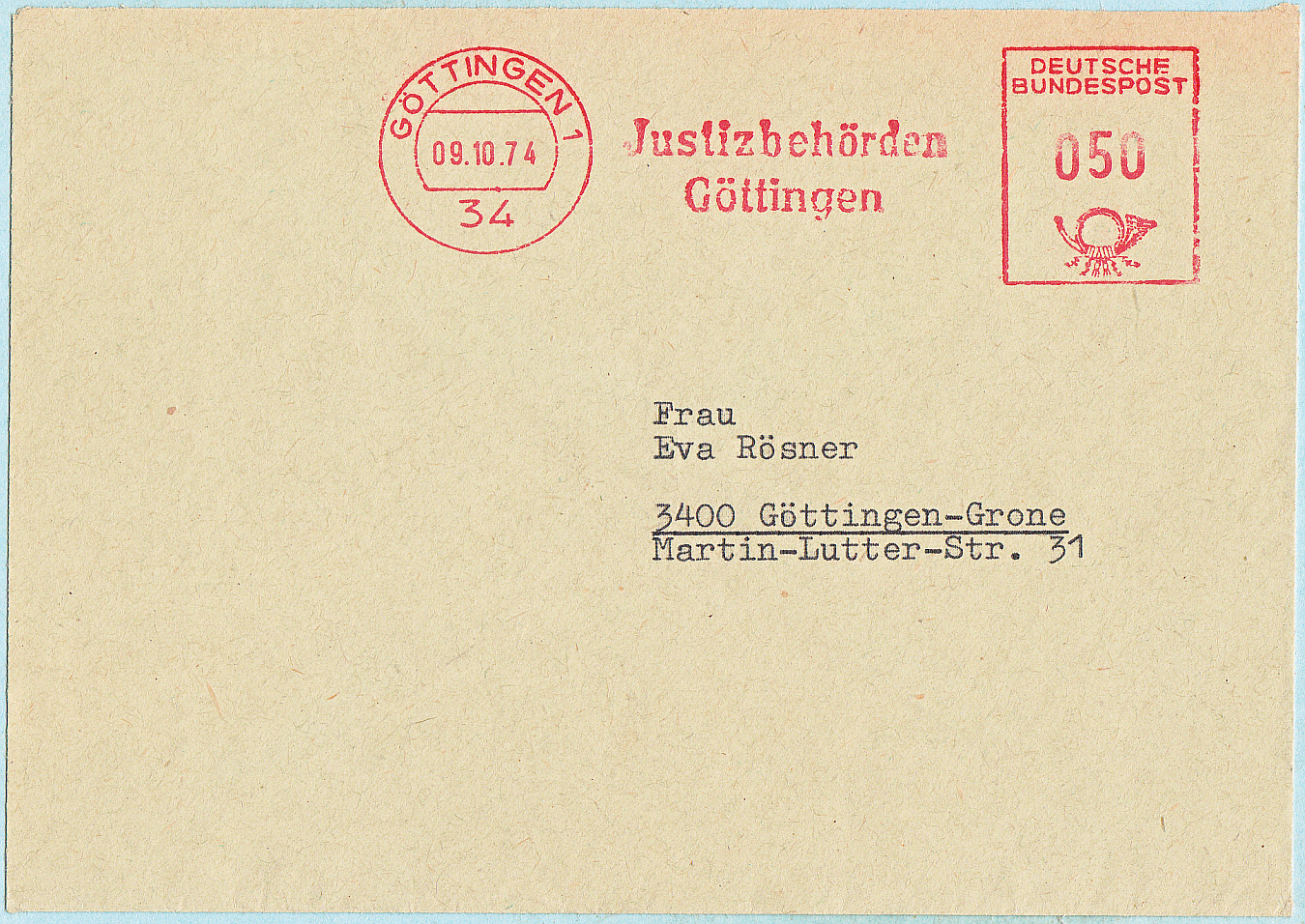 innerstädtischen Sendung der Justizbehörden Göttingen, freigemacht per AFS - noch im alten Format "Tagesstempel, Klischee und Wertstempel" zu 50 Pfennig: GÖTTINGEN 1 / 34 vom 09.10.1974. Klischee "Justizbehörden / Göttingen".