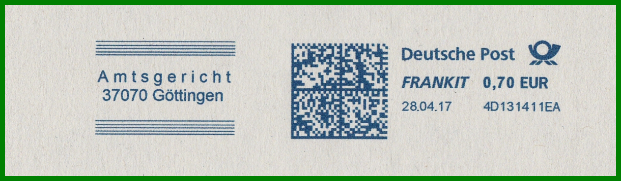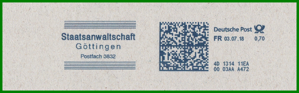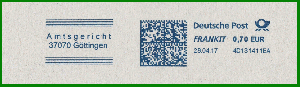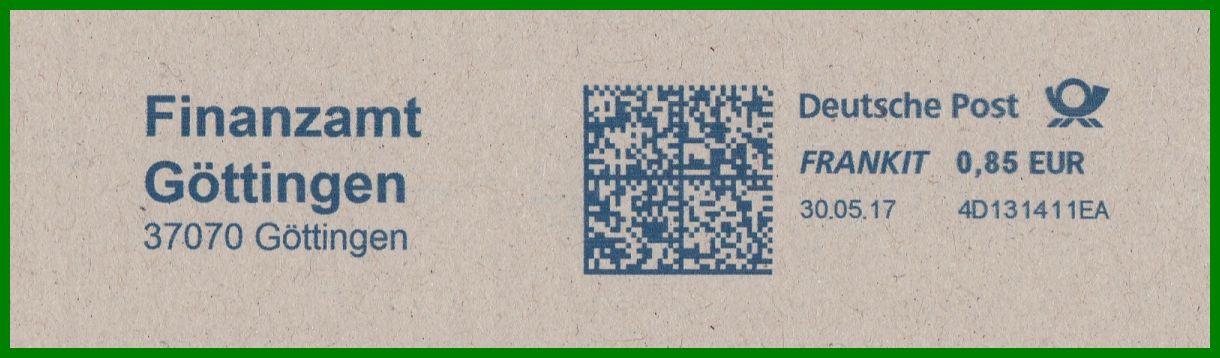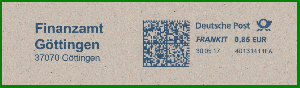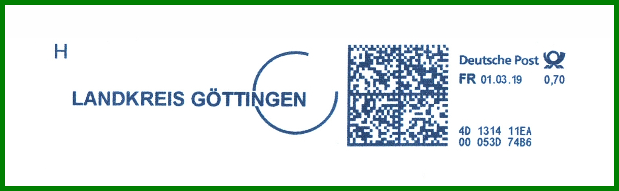 Übrigens wurde das oben genannte Pitney Bowes-Gerät 4D131411EA von Postcon Hannover für andere in Göttingen beheimatete Behörden verwendet, hier beispielsweise für das Amtsgericht Göttingen (28.04.2017), den Landkreis Göttingen (01.03.2019) und dem Finanzamt Göttingen (30.05.2017), neben weiteren privaten Absendern, was aber für diesen Beitrag wohl etwas zu weit führen würde. ;-)
