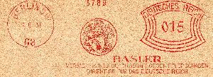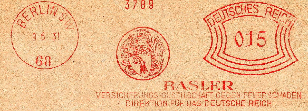 die Basler Versicherungsgesellschaft in Berlin SW 68 zeigt einen Drachen und das Wappen der Stadt Basel.