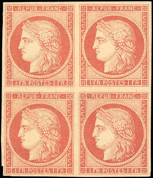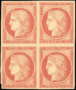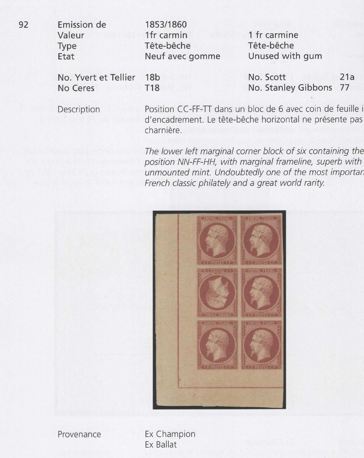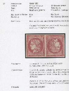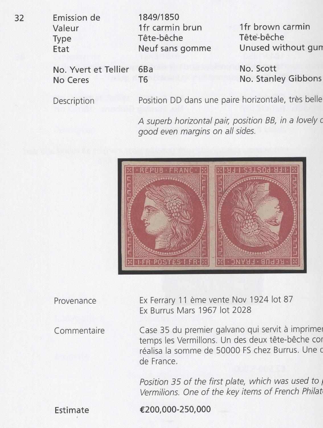 Wir dürfen also annehmen, dass Ferrary BEIDE Kehrdruck-Paare hatte: T6 (carmin foncé) und T6b (carmin-brun). Los 87 sei ein Exemplar carmin-brun, somit müsste also mindestens ein Los (88 oder 89) carmin-foncé sein. Diese Variante wird bei Spink-Maury ebenfalls sehr hoch bewertet: Euro 325'000