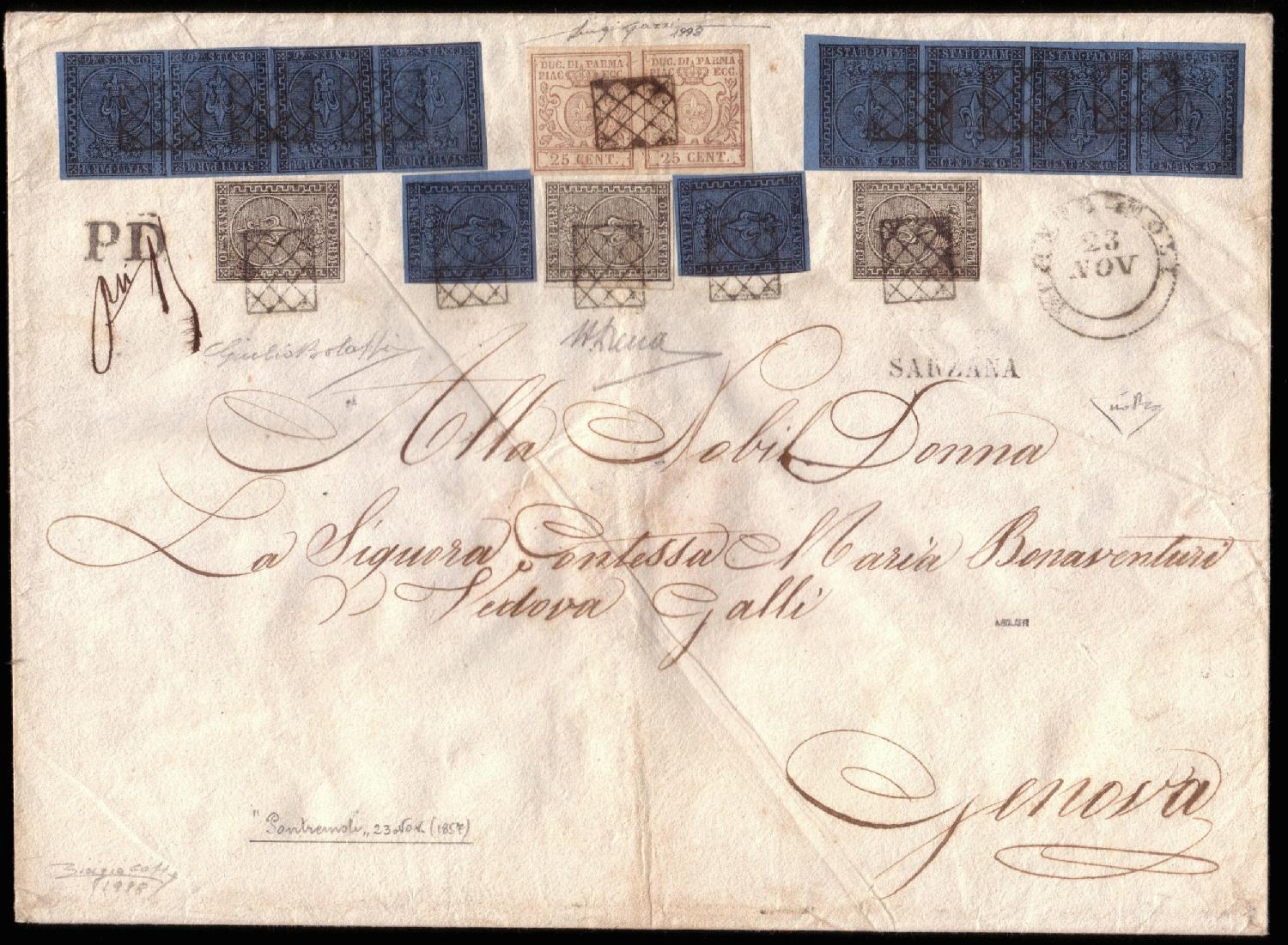 Ein außergewöhnlicher Briefumschlag, der die höchste Frankierung des Herzogtums Parma darstellt und zu den größten Raritäten aller alten italienischen Staaten zählt.