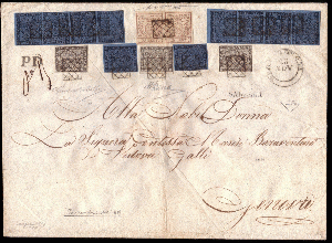 Briefumschlag von Pontremoli nach Genua, frankiert mit 4,80 Lire mit drei Exemplaren der 10-Centimo-Marke in Schwarz, zwei Einzelmarken und zwei äußerst seltenen Viererstreifen der 40-Centimo-Marke in Hellblau sowie einem Paar der 25-Centimo-Marke in Braun-Lila.