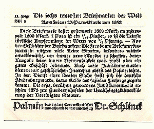 Was immer schön ist, wenn man von außerhalb Bestätigungen dafür bekommt, was man selbst ahnt und weiß. Auf diesem Palmin Sammelbild (Entstehungs-Jahr 1903 - 1915) wird Rumäniens Nr. 1, die 27 Parale Marke, als eine der 6 teuersten Briefmarken der Welt gekürt. Wie schön!