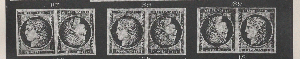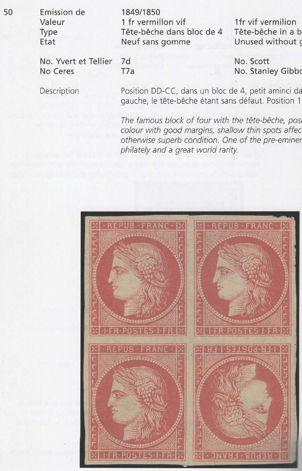"1ex connu neuf", Katalogwert Euro 375'000, also gemäss Spink/Maury ein Unikat; im Auktionskatalog steht aber: "Un des deux tête-bêche connus neuf". Dies dünkt mich etwas seltsam, denn im Auktionskatalog von 1924 entdecken wir gleich drei fast identische Lose: