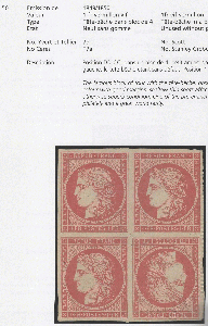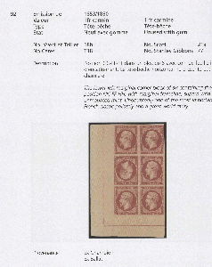 Der Kehrdruck aus diesem Bogen wurde als Viererblock bei der am 18.11.1924 bei der 11. Ferrary-Aution als Los 59 angeboten und für 200.500 Francs verkauft.