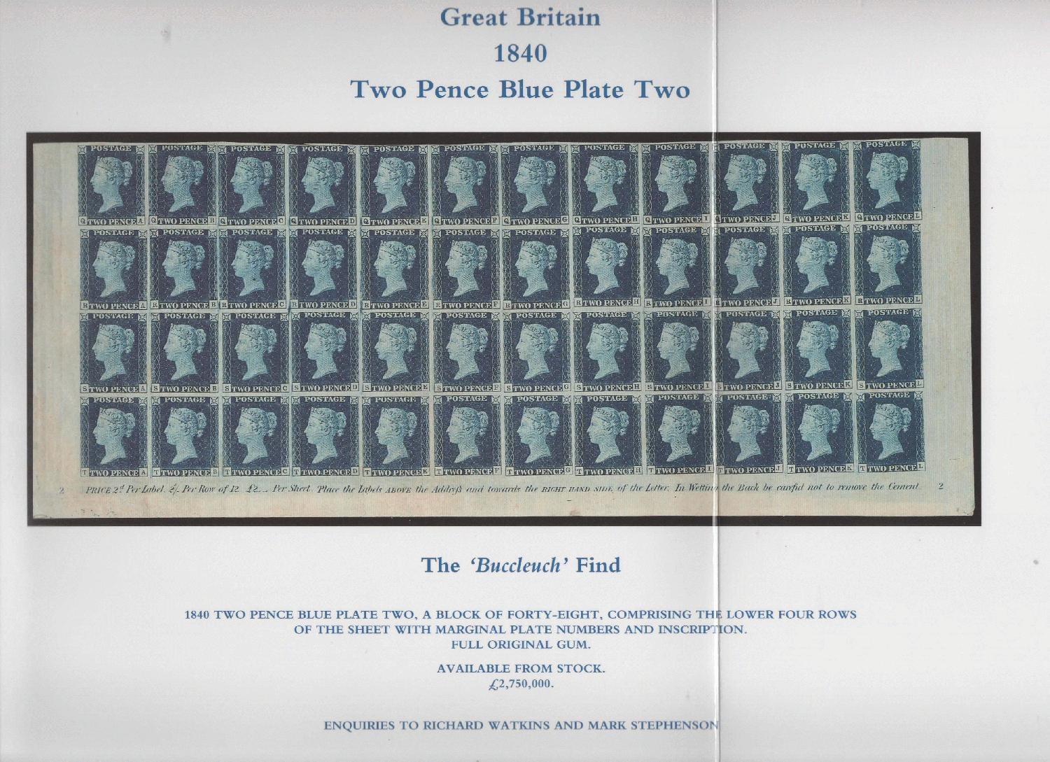 H.R. Harmer pries das Stück in den höchsten Tönen an: «It is undoubtedly the most valuable philatelic piece of Great Britain in existance» (Quelle: Annual Résumé of the H.R. Harmer Stamp Auctions – Season 1945-46). Auf einem grossen Foto wurde das Schreibset abgebildet, worin sich die zwei grossen Teilbogen befanden. Auch das Schloss wurde abgebildet, und der prächtige 48er-Block wurde farbig abgebildet auf zwei Seiten. Im «Résumé» lesen wir auch, dass im Juni (1946) der Gesamtfund für GB£ 6'300 an einen englischen Sammler verkauft wurde.