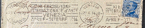 Er wurde am 7. Juni 1914 anlässlich der 11. Internationalen Kunstausstellung in Venedig aufgebracht, die von April bis Oktober 1914 lief. Die Inschrift Ferrovia (=Eisenbahn) lässt darauf schließen, dass sich die Bandstempelmaschine im damaligen Bahnpostamt in Venedig befand.