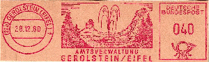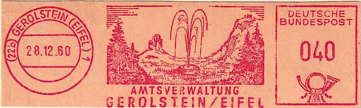 im AFS vom 28.12.1960 aus (22b) GEROLSTEIN (EIFEL) 1 macht die AMTSVERWALTUNG GEROLSTEIN/EIFEL mit einer hochaufsteigenden Wassersäule auf eine uralte Mineralquelle und wohl auch bedeutenden Wirtschaftsfaktor aufmerksam.