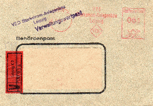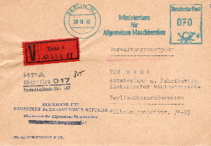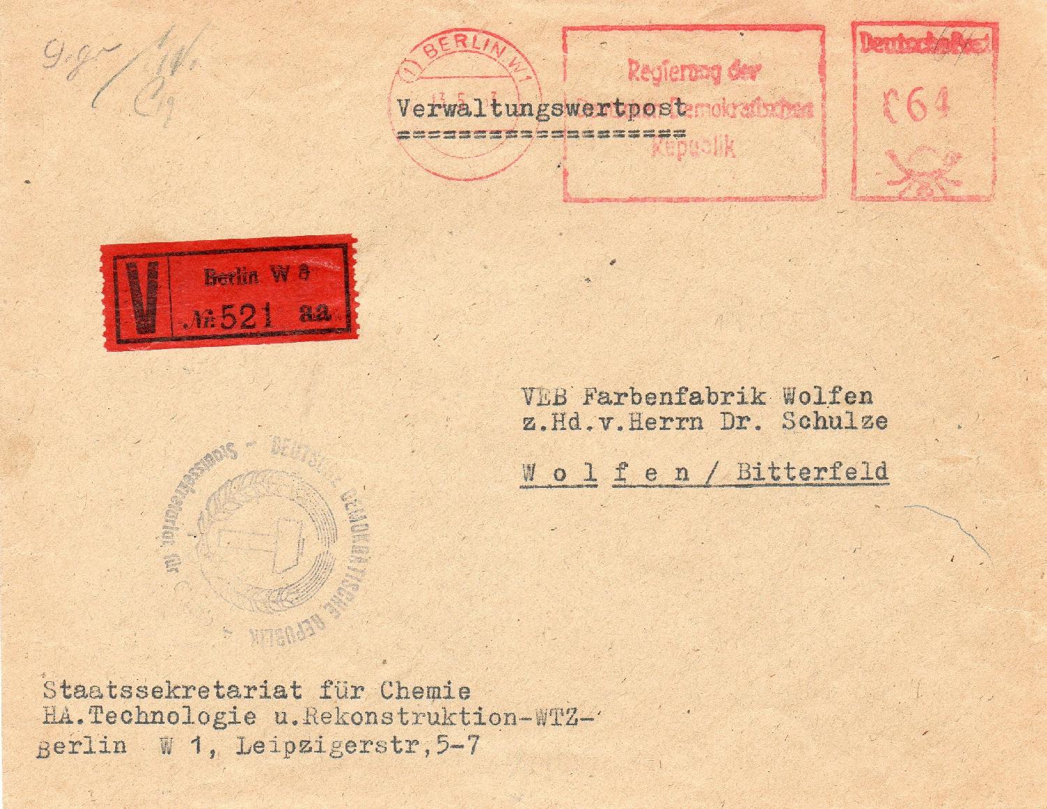 Die Poststelle der "Regierung der DDR" in BERLIN sandte im Mai 1953 diesen Beleg zur VEB Farbenfabrik Wolfen, das Entgelt (Porto 24 + Gebühr 40 Pfg) entrichtet auf ihrer AFS-Maschine, hinzugesetzt ein violetter Dienststempel.