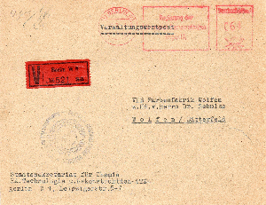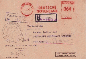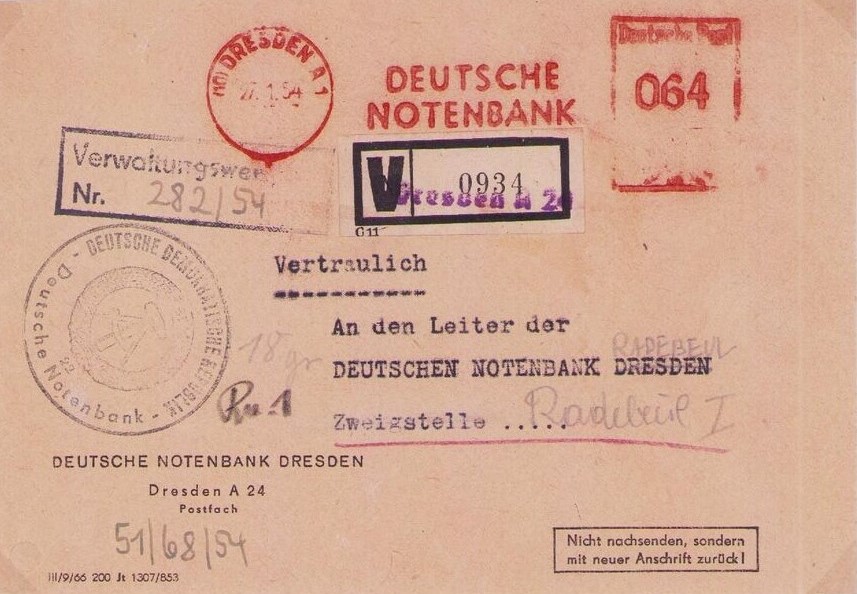 Interessant bei diesem Beleg vom Januar 1954 ist der verwendete R-Zettel auf weissem Papier vom Postamt DRESDEN 1, aufgegeben wurde der Brief von der Deutschen Notenbank, ferner wurde ein Rechteck-Stempel "Verwaltungswertpost" sowie ein violettes Dienstsiegel des Absenders aufgedruckt.