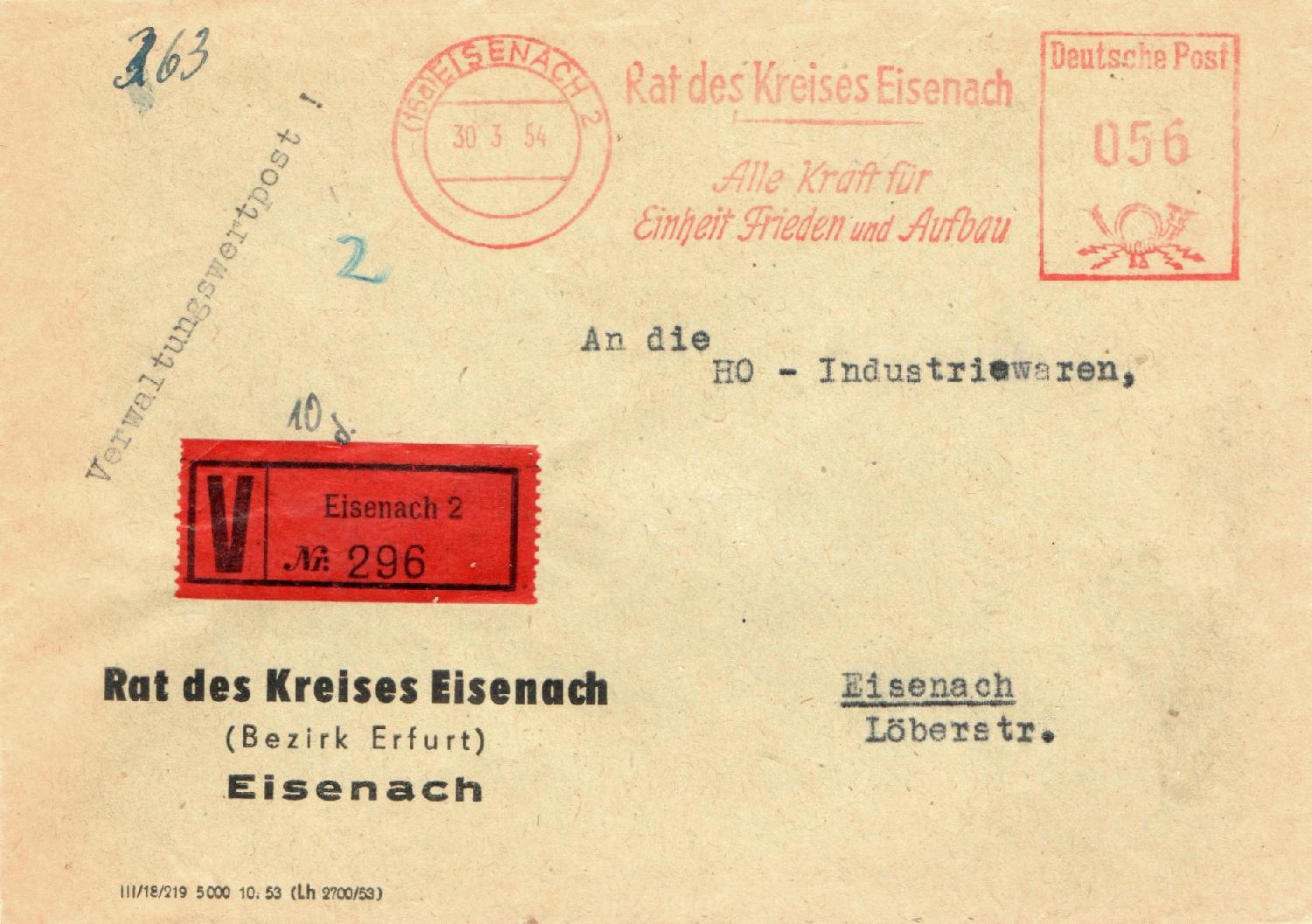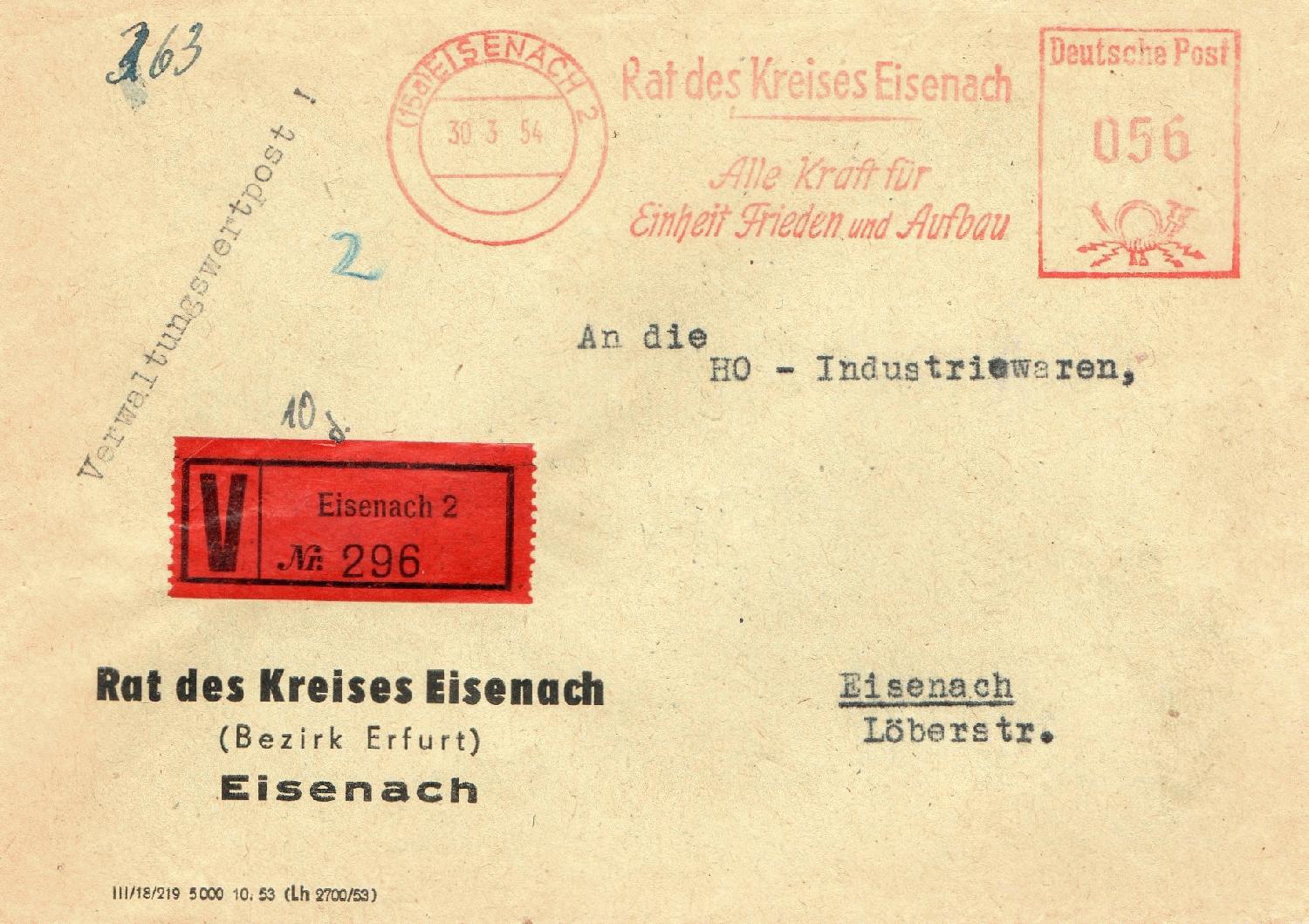 Orts-Verwaltungswertpost, aufgegeben im März 1954 in EISENACH, das Entgelt (Porto 16 Pfg + Gebühr 40 Pfg) entrichtet mit Absenderfreistempel.