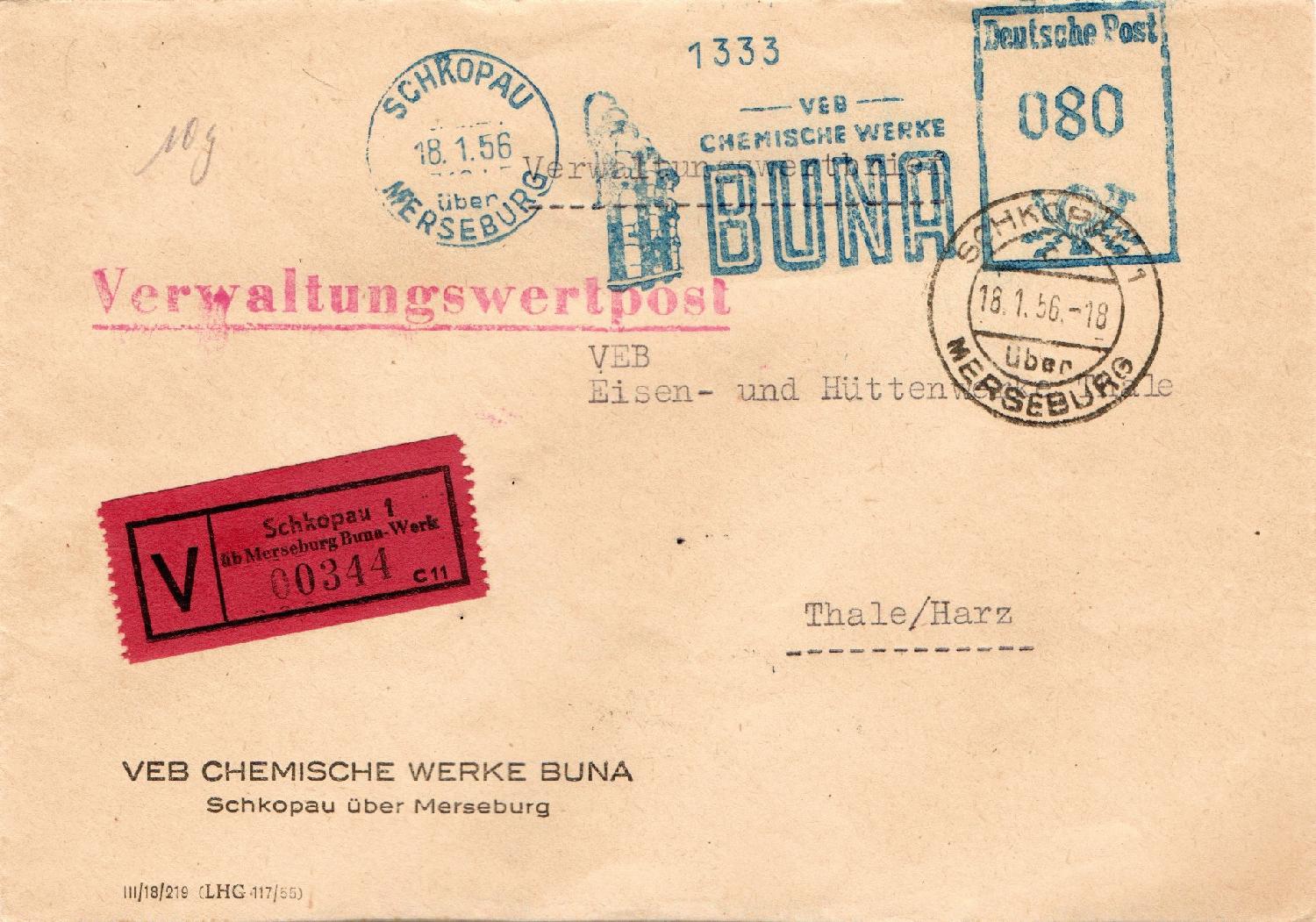 Fernbrief im Gewicht von 10 g, aufgegeben im Januar 1956, interessant der "Selbstbucher"-V-Zettel" mit Inschrift "SCHKOPAU 1 üb. Merseburg Buna-Werk".