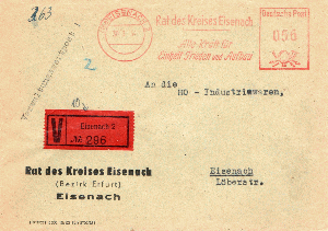 Dieser Beleg wurde im Ortspostbetrieb von EISENACH im März 1954 versandt, die Gesamtgebühr von 56 Pfg setzt sich aus dem Ortsporto von 16 Pfg sowie der Wertpostgebühr von 40 Pfg zusammen, hier verrechnet mit einem Absenderfreistempel.