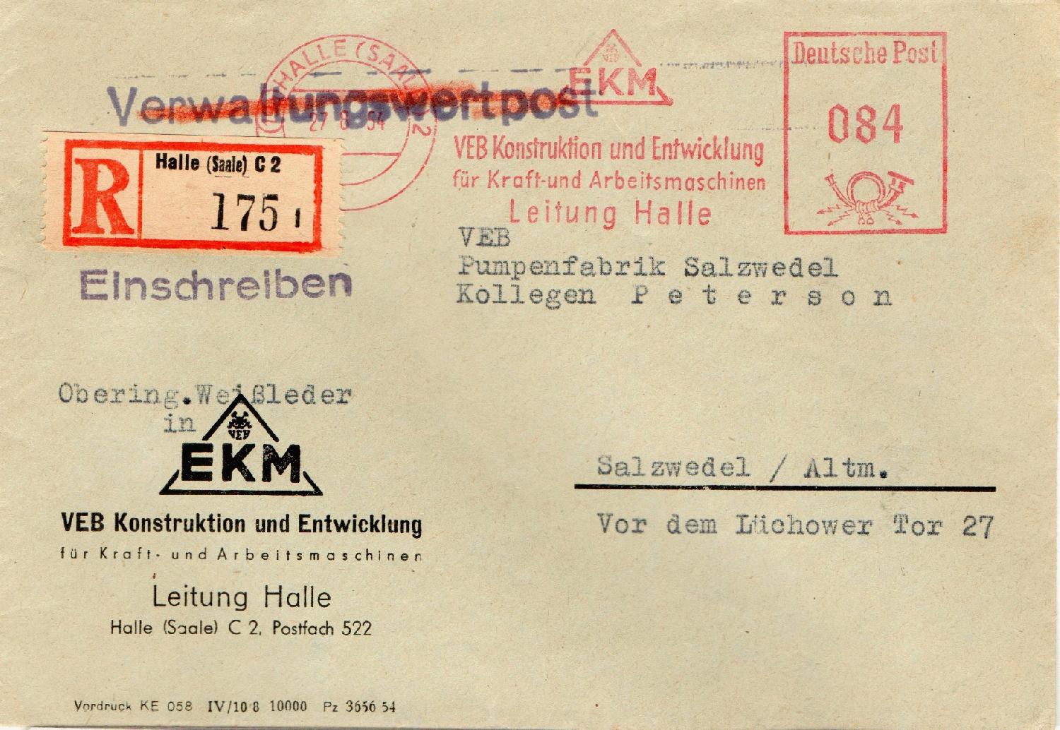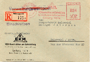 84 Pfennig war damals meines Wissens das Porto für einen Einschreib-Fernbrief. Das würde aber bedeuten, dass der Brief als Einschreibbrief freigemacht wurde, bevor ein Postmitarbeiter hier mit dem Rotstift tätig werden konnte. Ich vermute deshalb, dass schon in der Poststelle des VEB EKM der Stempel "Verwaltungswertpost" als unrichtig erkannt und deshalb durchgestrichen wurde.