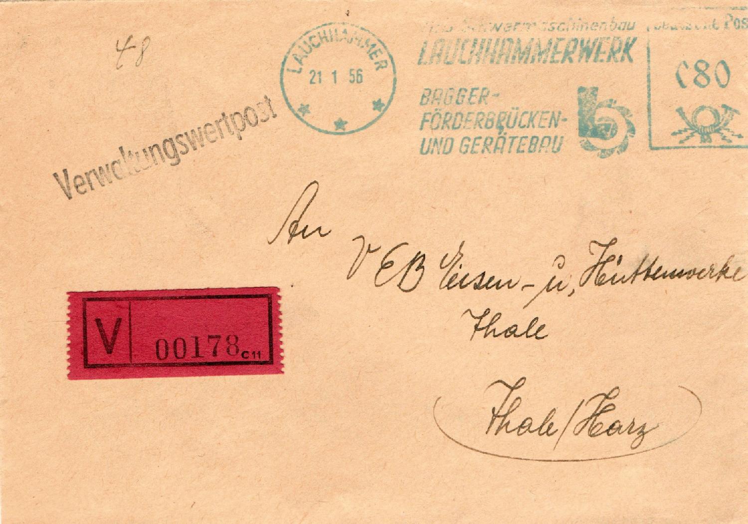 Fernbrief im Gesamtentgelt (Porto 20 + Gebühr 60 Pfg) von 80 Pfg, verschickt im Januar 1956 vom Postamt LAUCHHAMMER aus, interressant der V-Zettel ohne Angabe des Aufgabepostamtes.