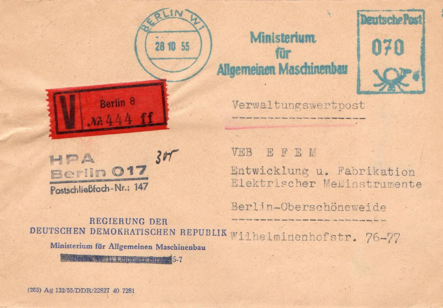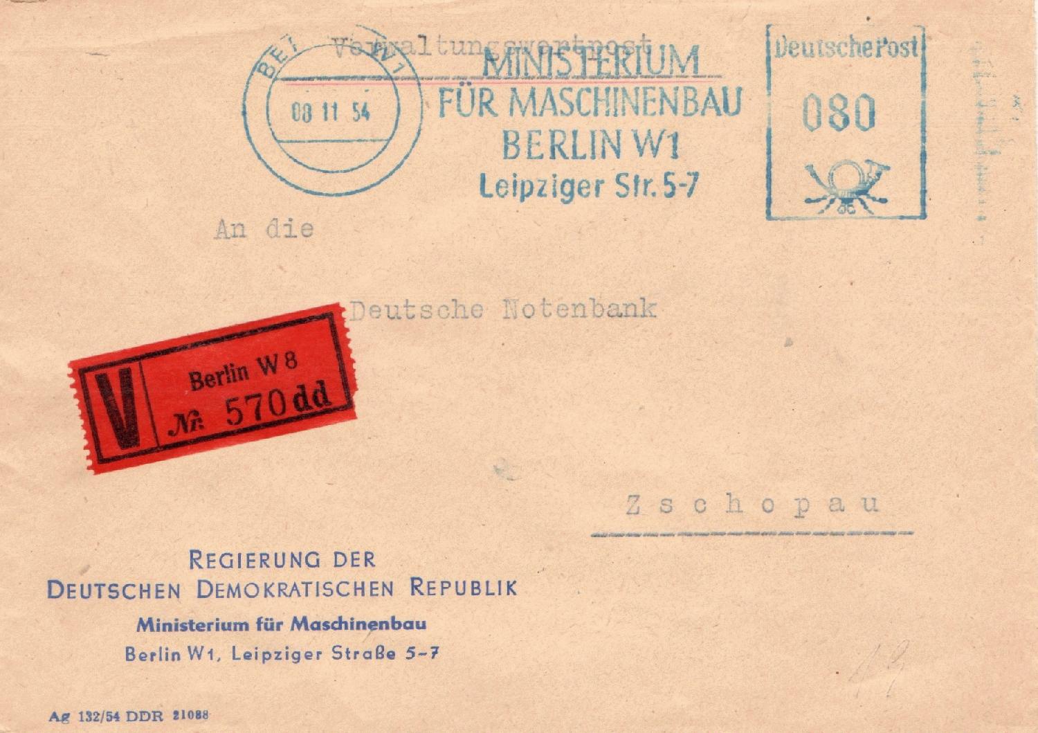 Das Gesamtentgelt (Porto 20 + Gebühr 60 Pfg) entrichtet im November 1954 vom Ministerium für Maschinenbau auf einer AFS-Maschine, der rote V-Zettel weist die Unterscheidungsbchstaben "dd" auf.