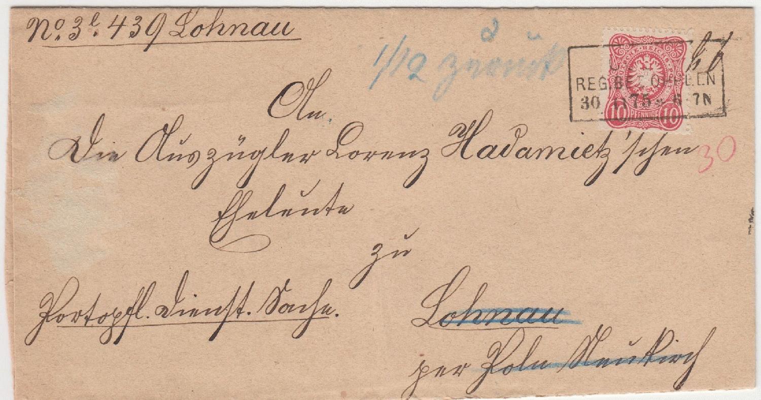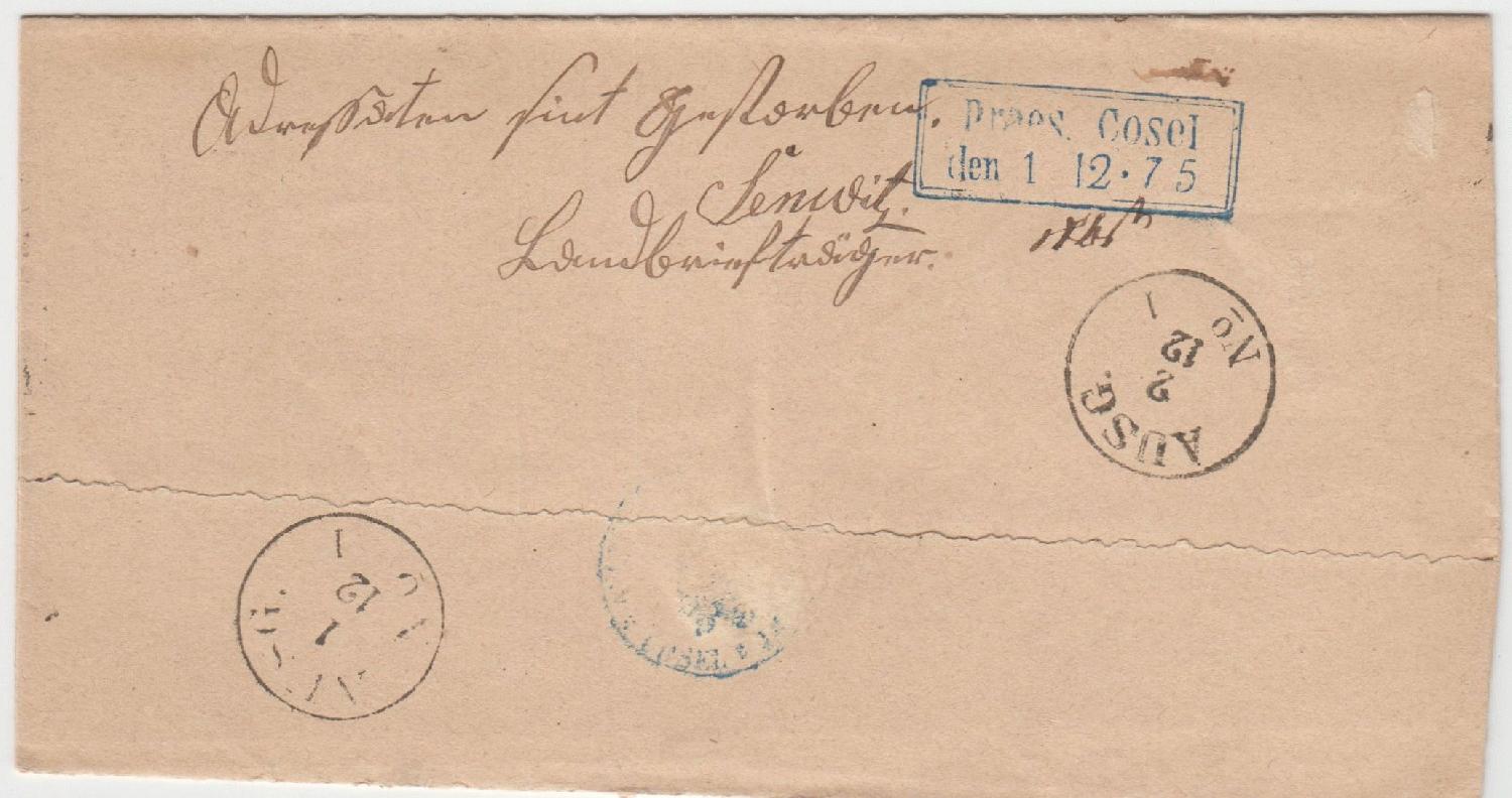 ein Faltbrief vom Grundbuchamt in Cosel (Reg. Bez. Oppeln) nach Lohnau/Łany aufgegeben am 30.11.1875. Rückseitig ein blauer Präsentiert Stempel und die Ankunft in Lohnau am 1.12.1875. Da der Empfänger verstorben war ging der Brief zurück nach Cosel, Ankunft dort einen Tag später.