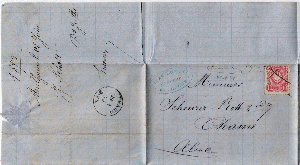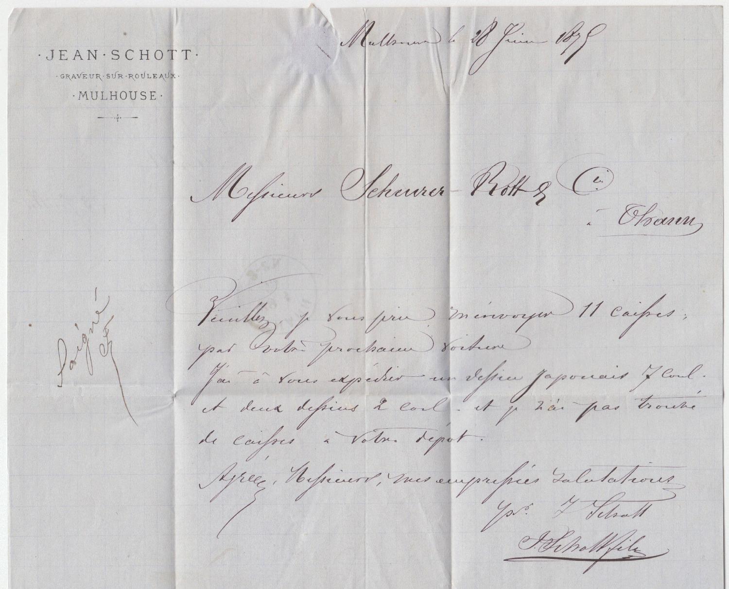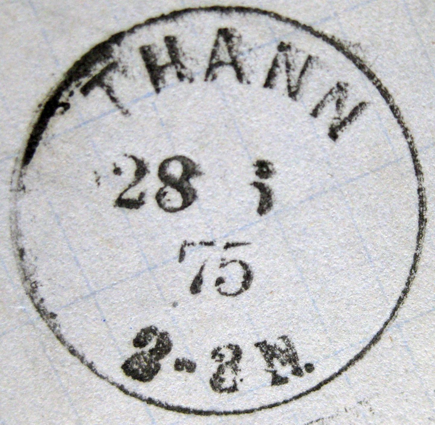 ein Faltbrief aus Mulhouse im Elsass nach Thann - dort in der Nähe - vom 28.6.1875. Aufgegeben und Entwertung der Frankatur per Federstrich wohl bei der Bahn, diese gab es da schon seit 1837. In Thann bekam er dann einen Ankunftstempel.
