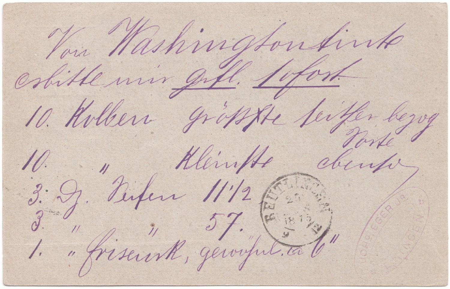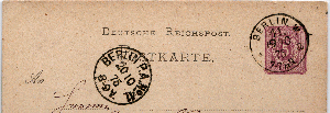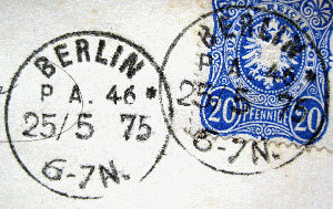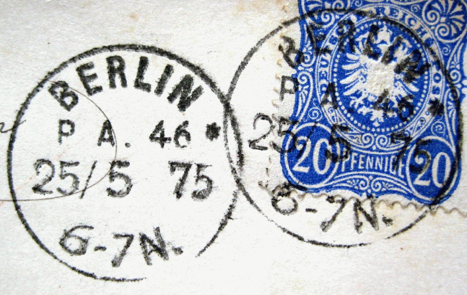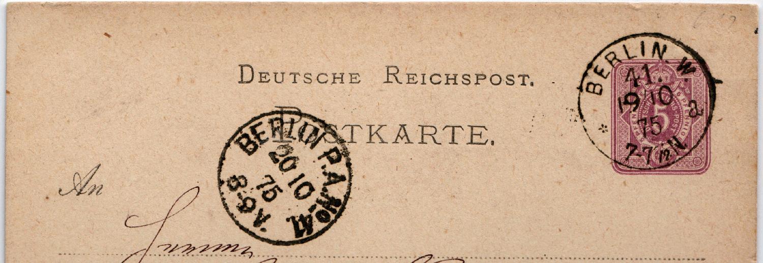 der Einkreisstempel Berlin W 41.*a abgeschlagen vor 150 Jahren auf einer Ganzsache P5 im Ortsverkehr. Als Ankunft/Bestellstempel (am nächsten Tag) wurde ein Typ mit der alten Postanstaltsbezeichnung - PA No. 41 - verwendet. 1873 wurde die Postanstalt 41 zum Postamt umgewandelt. Die Umbenennung des Postamtes zu W 41 erfolgte am 1.7.1875.