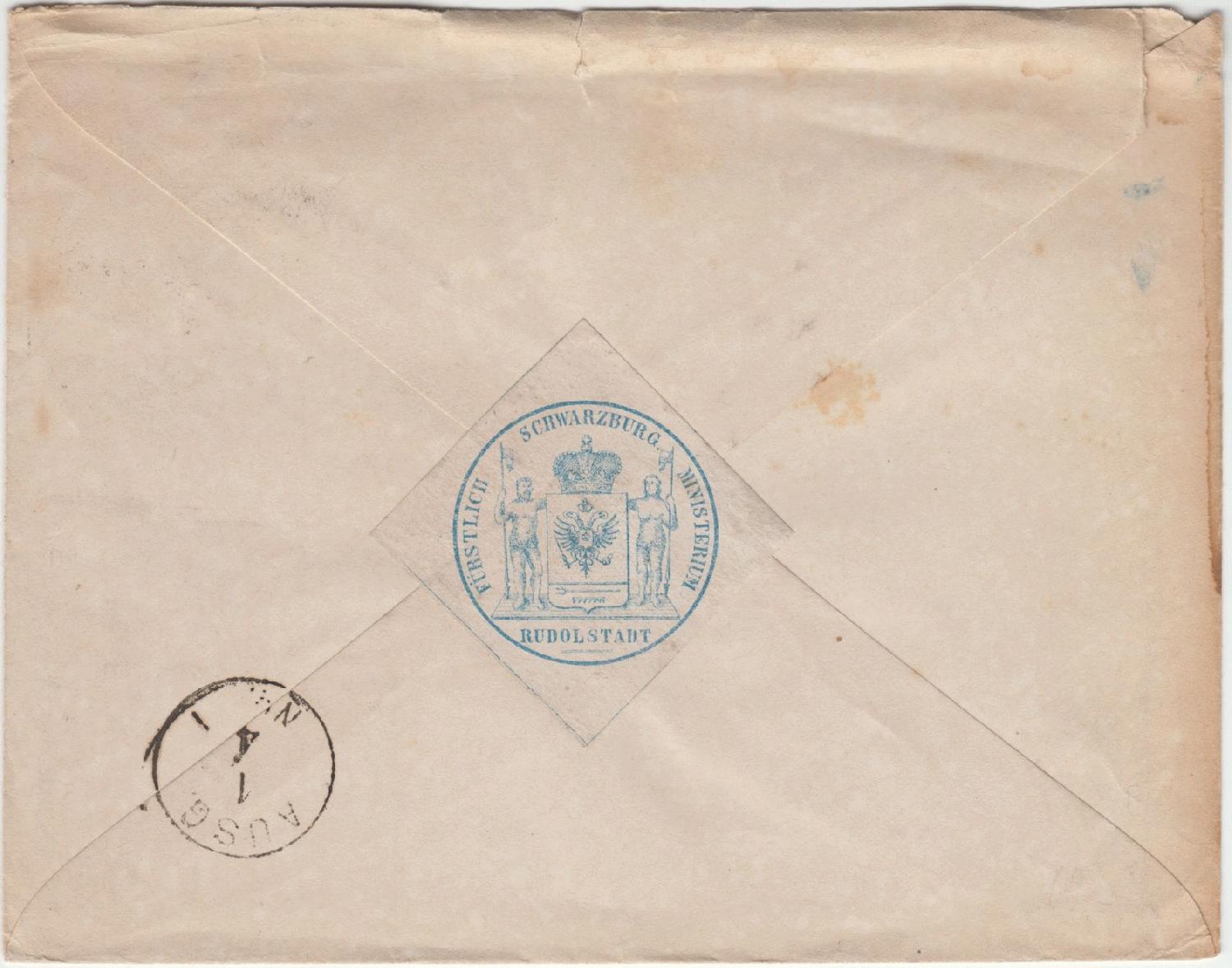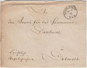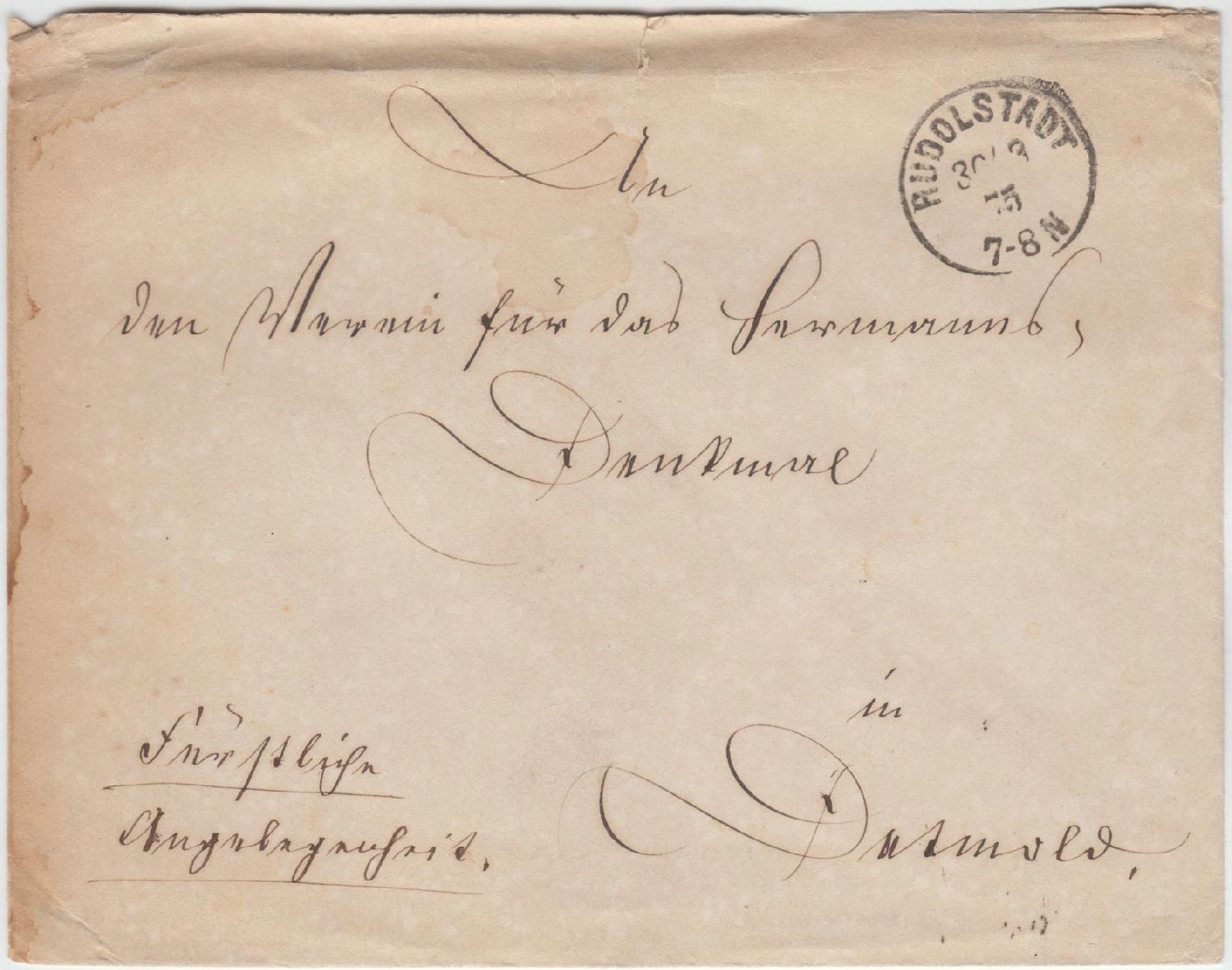 ein portofreier Brief aus Rudolstadt nach Detmold vor 150 Jahren aufgegeben. Absender war das Fürstliche Ministerium Schwarzburg Rudolstadt, Empfänger der Verein für das Hermannsdenkmal. [1]