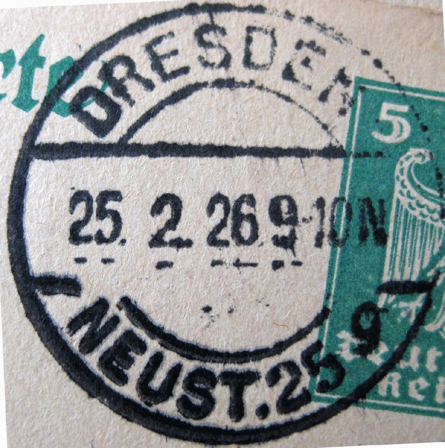 noch mal der Ausschnitt einer Ganzsachenpostkarte mit dem Abdruck eines Handstempels. Dieser entstand vor 100 Jahren im Postamt 25 von Dresden-Neustadt. Hier hat der Stempel noch die 12 Stunden Uhrzeit (mit V und N). Etwas später wurde dieser Teil geändert und der Stempel hatte dann die 24 Stundenanzeige ( 0 bis 23).
