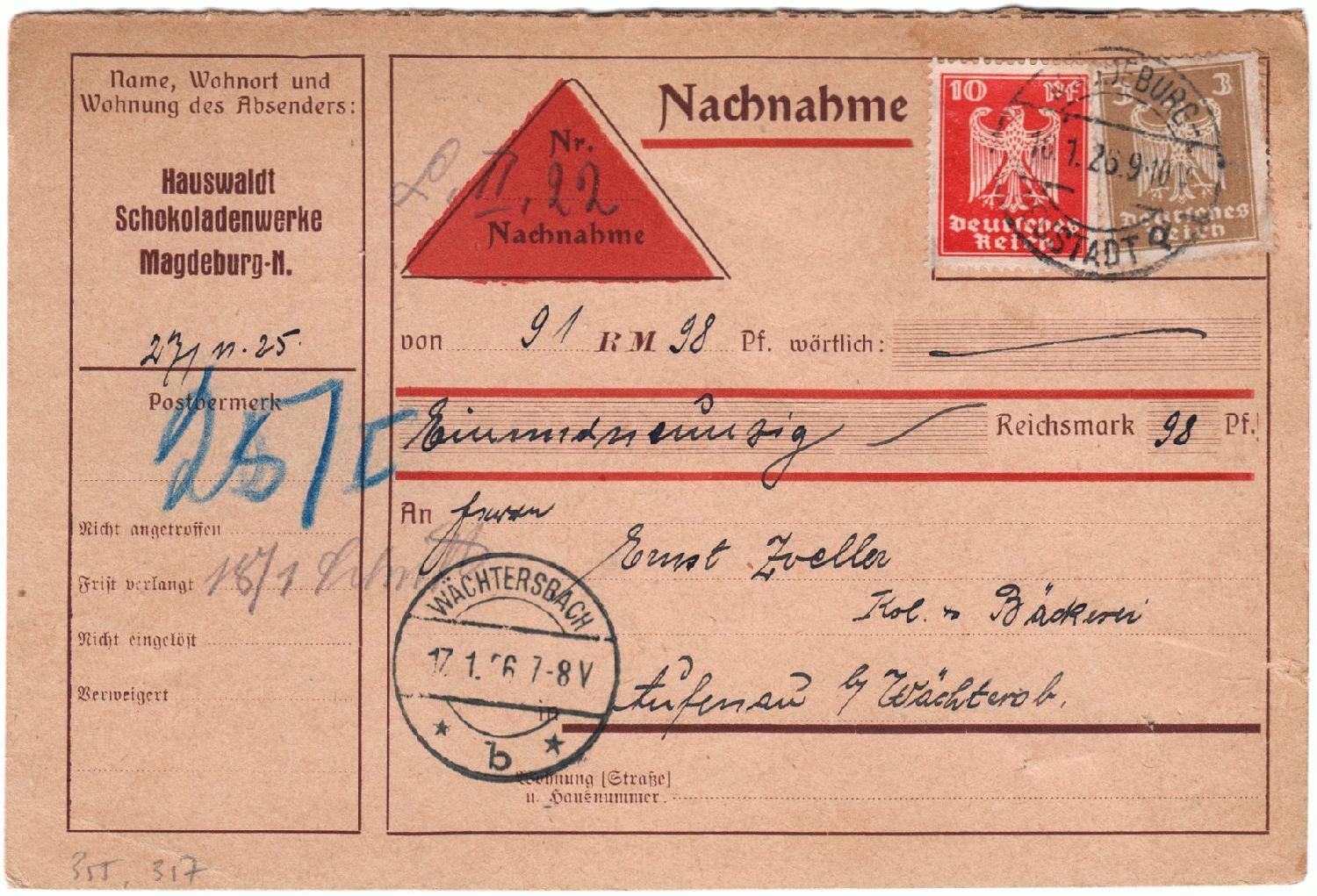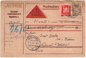 heute wieder mal etwas 100 jähriges. NN-Karte aus Magdeburg-Neustadt nach Aufenau bei Wächtersbach, heute ein Stadtteil von Wächtersbach. Aufgegeben am 16.1.1926 und einen Tag später in Wächtersbach angekommen. Frankatur korrekt, 3 Pfg. Drucksache und 10 Pfg. Nachnahme.