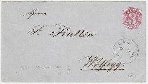 heute eine 3 Kreuzer Ganzsache aus Württemberg, aufgegeben in (Bad) Saulgau am 9.6.1875 (vor 150 Jahren) nach Wolfegg. Ankunft - nach einem Zwischenstopp in Aulendorf - am gleichen Tag, der Zweikreisstempel von Wolfegg ist gerade noch so zu erkennen.