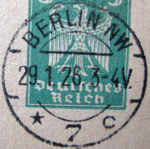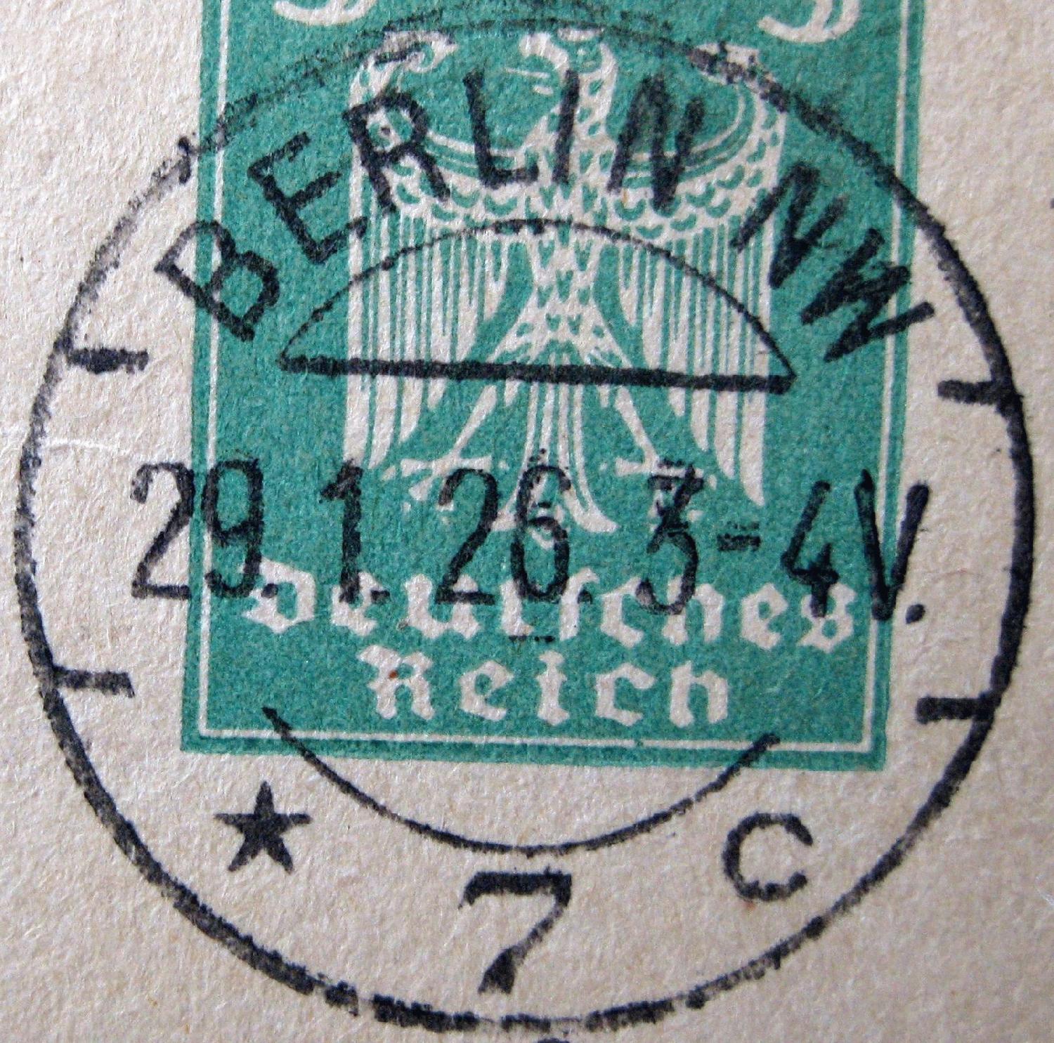 der nächste 100 jährige Abschlag kommt aus Berlin. Dieser gehört zum Typ 3 des Kreisstegstempels mit Bogen oben und unten "BERLIN NW / * 7 c".