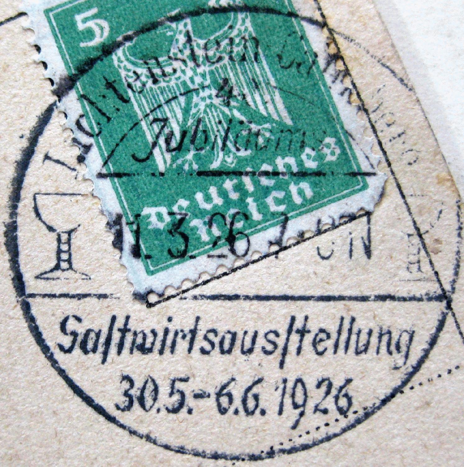 Noch eine Ergänzung für heute. Bochmann Nr. 1 von Lichtenstein-Callnberg - für die Ankündigung der 40. Jubiläums=Gastwirtsausstellung 30.5.-6.6.1926 - vor 100 Jahren abgeschlagen auf einer Postkartenfrankatur.