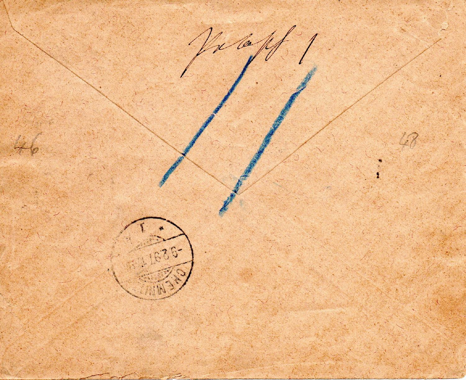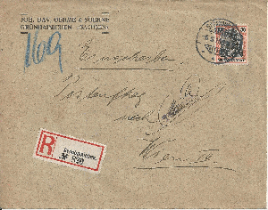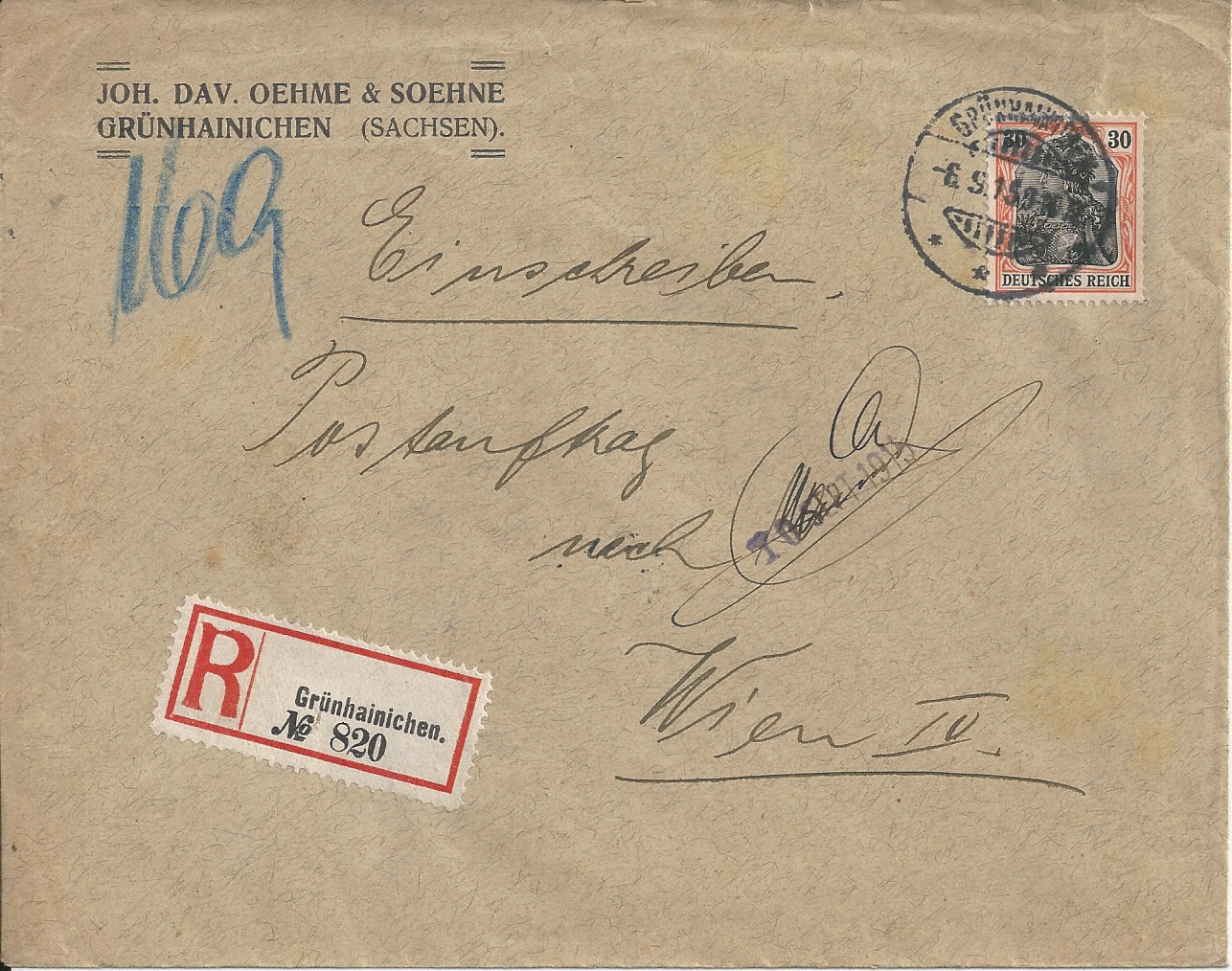Hier ein Postauftrag vom 6.9.1915 von Grünhainichen in Sachsen nach Wien. Die Gebühr für den Postauftrag betrug 30 Pfennig. Rückseitig sehen wir den Vermerk "Inhalt geprüft amtlich verschlossen I.A. Hinkelmann Gehilfin" und den Negativstempel ? von Grünhainichen. Vorderseitig ist noch der Erledigungsvermerk