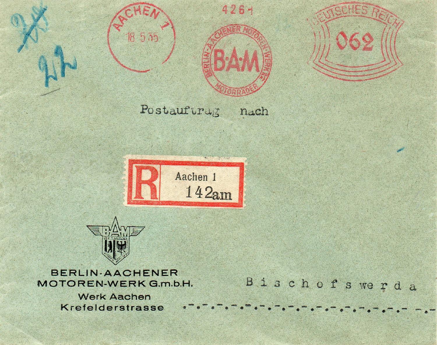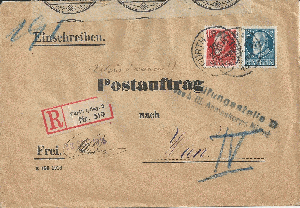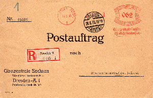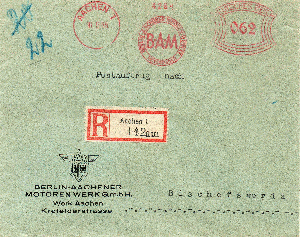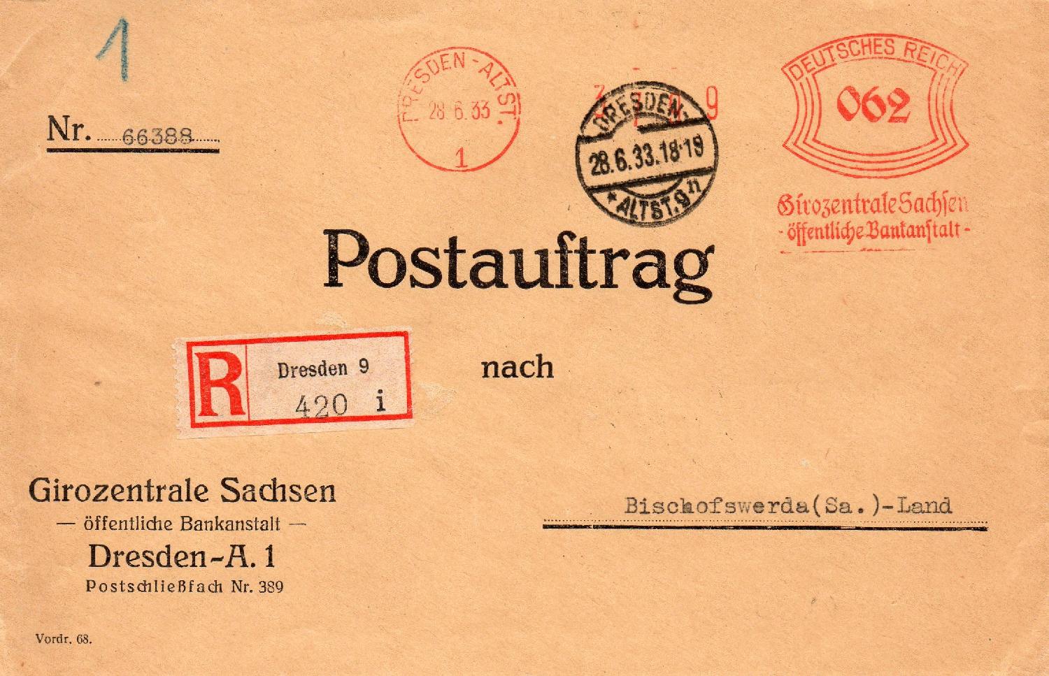 Die Gebühr für einen Postauftrag wurde im Juni 1924 von 40 auf 50 Rpf angehoben, blieb dann bis zum Ende der Reichspost bestehen. Im März 1932 kam hier ein Francotyp-AFS der Type „E-1“ zum Einsatz, die Gebühr von 58 Rpf wurde für den Ortstarif berechnet.